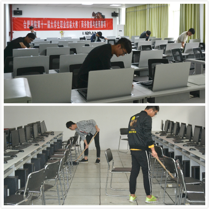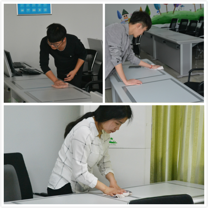 本次活动共安排近100名学生对我院一、三、四、五楼的16个机房和实训室进行了彻底清扫,由各班班长和生活委员带队打扫机房卫生。清扫范围主要包括:“祛痘”——机房墙壁边角的清理,抠挖塞在隐蔽角落里的垃圾;“磨皮”——地面清洁,主机、显示屏和桌面的灰尘清洁;“瘦脸”——椅子收起,屏幕推进,键盘鼠标归位,所有设备恢复原状。同学们秩序井然、分工明细,在短短一个小时的时间内把机房打扫的一尘不染、焕然一新。