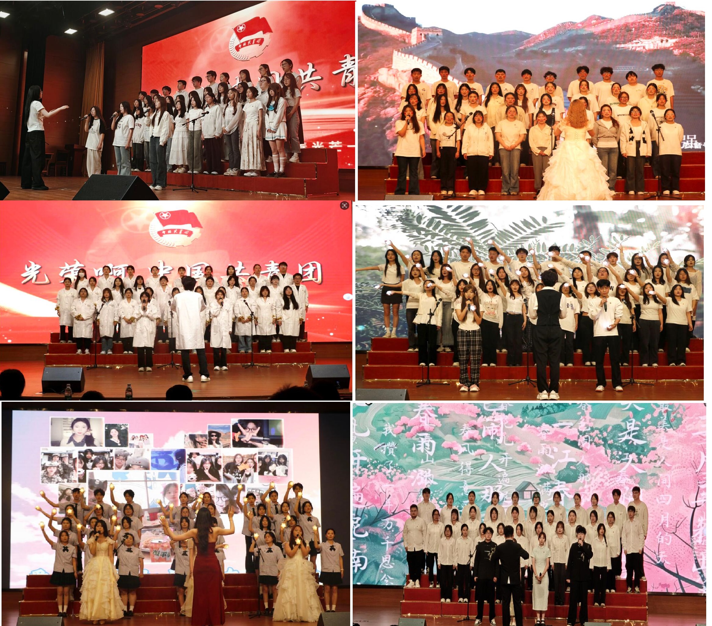 大赛在主持人热情洋溢的开幕词与嘉宾介绍中拉开帷幕。本届大赛延续“红色经典+青春流行”双主题赛制,各班通过合唱形式展现多元创意。红色篇章中,各班以《光荣啊,中国共青团》为固定曲目,讴歌伟大时代,凝聚青春力量。青春篇目中,各班演唱青春流行歌曲,通过互动道具与创意队形,演绎班级团结奋进的青春故事。各班级满怀热忱,依次登台献唱,以多元曲风展现青春风采:《夜空中最亮的星》传递希望,《稻香》诠释温暖力量,《我乘着风飞过来》彰显无畏朝气,《上春山》则表达对春天、生活、祖国和未来的热爱与信心......各班级以独特演绎尽展班级风采,奏响青春激昂乐章。