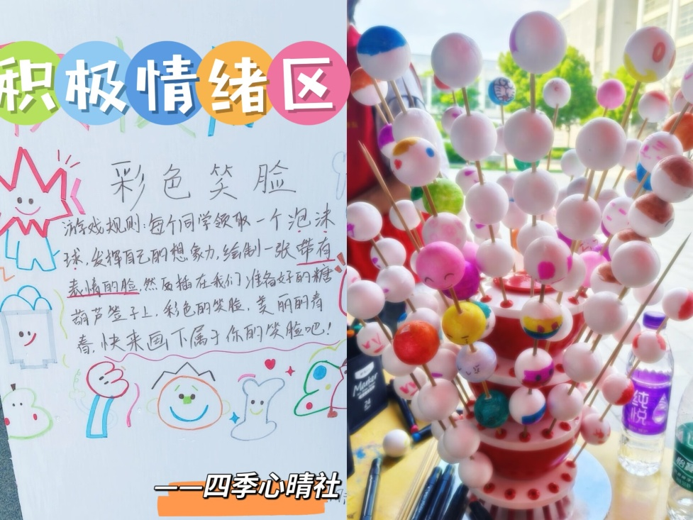 5月14日,在大学生活动中心广场前,“彩色笑脸”活动热闹开展。同学们纷纷拿起画笔,绘制出一个个色彩斑斓的笑脸。这些笑脸如同温暖的阳光,传递着积极情绪,让整个校园都充满了欢声笑语。