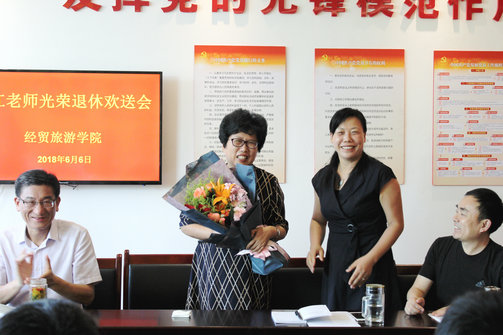 经贸旅游学院院长赵红代表全体教职工向吴红老师献上鲜花,对吴红同志对学院发展所做出的贡献表示感谢。