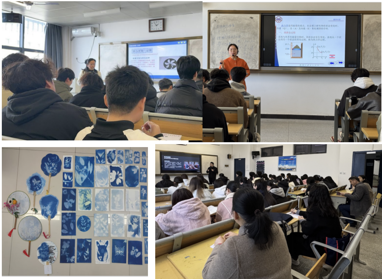 何杨老师《大学美育》以“蓝晒实践”激活美育课堂,引导学生采集自然素材创作蓝晒作品,在光影化学中感悟自然之美与匠心之趣;张鹏老师《中华优秀传统文化》带师生“穿越盛唐”,以社会风貌为经纬、诗人轶事为纽带,生动解构唐诗的历史华章与文化神韵;储开念、邱茂琴博士的《物理学》课堂分别聚焦热力学平衡与理想气体定律,将抽象原理融入生活案例,通过启发式教学深化专业认知。课后深度评课交流,实现了专兼职教师教学理念的碰撞融合。