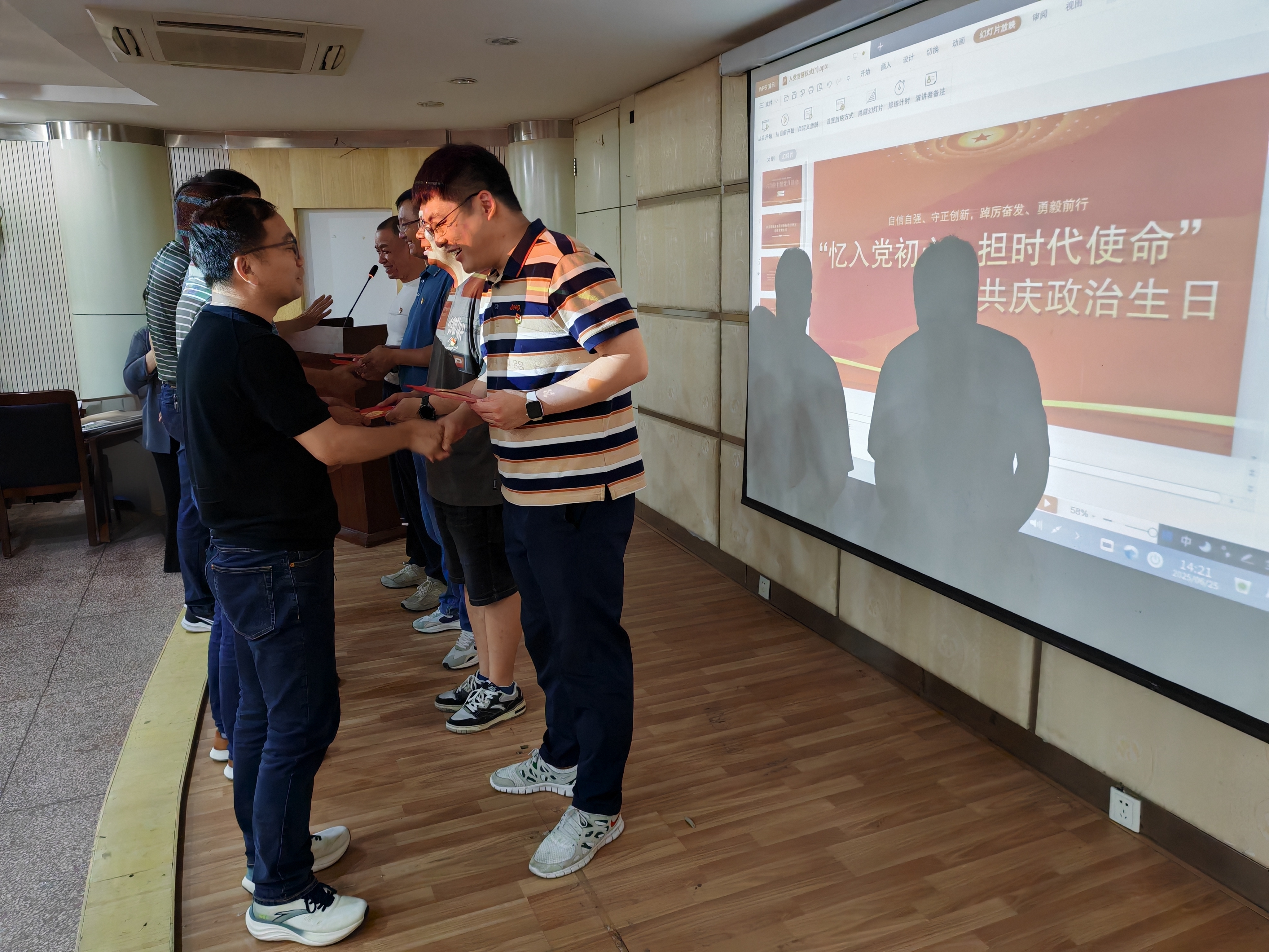 刘靖、许鹏、邹坤等同志代表党总支,为在4月至6月期间光荣加入中国共产党的同志们送上“政治生日”贺卡。一张张贺卡,传递着组织的关怀与祝福,提醒每一位同志时刻铭记自己的“政治生日”,不忘入党时许下的铮铮誓言。