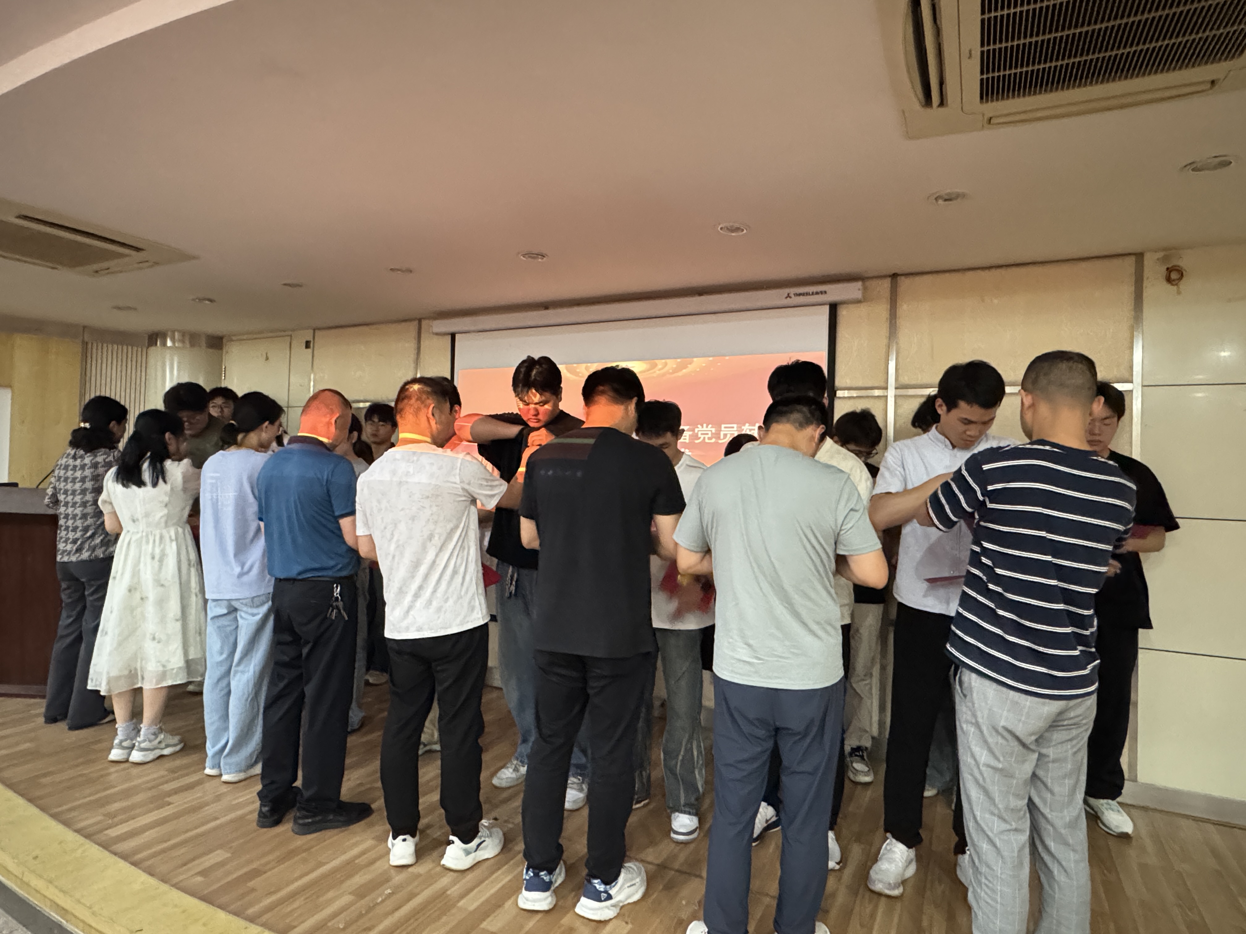 随着嘹亮的《国际歌》的奏响,活动拉开了帷幕。首先由党员老师们为新发展预备党员和转正党员佩戴上党徽,并送上了承载着组织深切期望的“政治生日”贺卡。