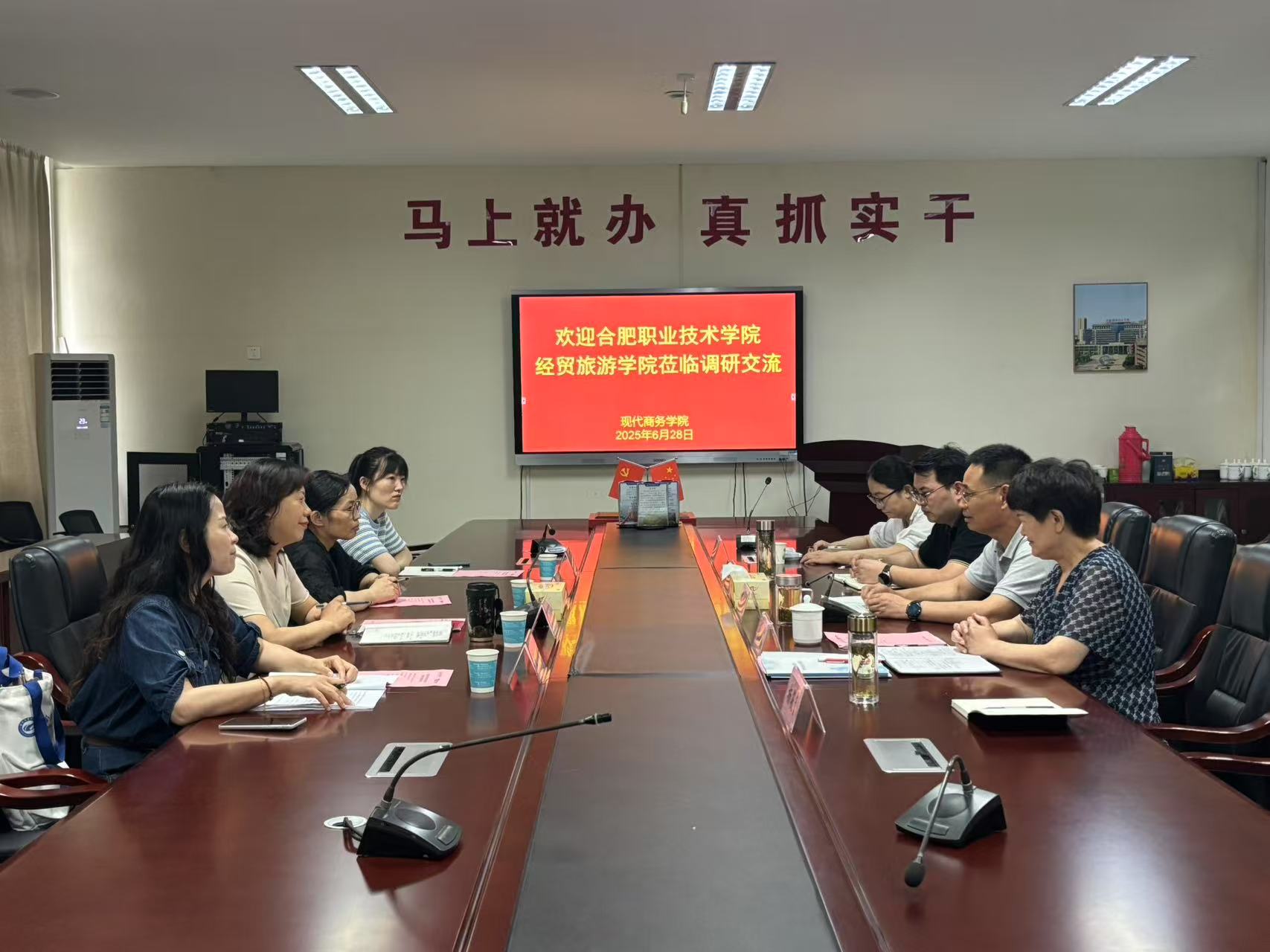 为学习借鉴本科层次职业教育建设的先进经验,加快推进经贸旅游学院内涵式发展与提升,6月28日,经贸旅游学院院长赵红率队,副院长付晓兰、会计教研室主任王欢、副主任屠欢一行四人,专程赴安徽职业技术大学现代商务学院进行“升本经验学习”专题调研。此次调研受到安徽职业技术大学现代商务学院的热情接待。