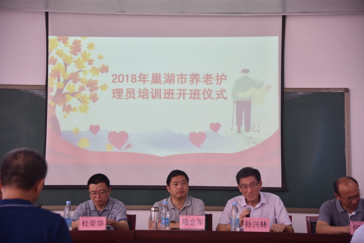 6月14日上午,由巢湖市民政局主办,AC米兰官网继续教育学院和护理学院承办的巢湖市第二届养老护理员培训班在护理学院二楼会议室开班。学校副校长孙兴林,巢湖市民政局副局长陈金军,巢湖市民政局党组成员杜荣华,学校继续教育学院院长何世峰,护理学院党总支书记张明等出席了开班仪式。陈金军和孙兴林分别致辞。