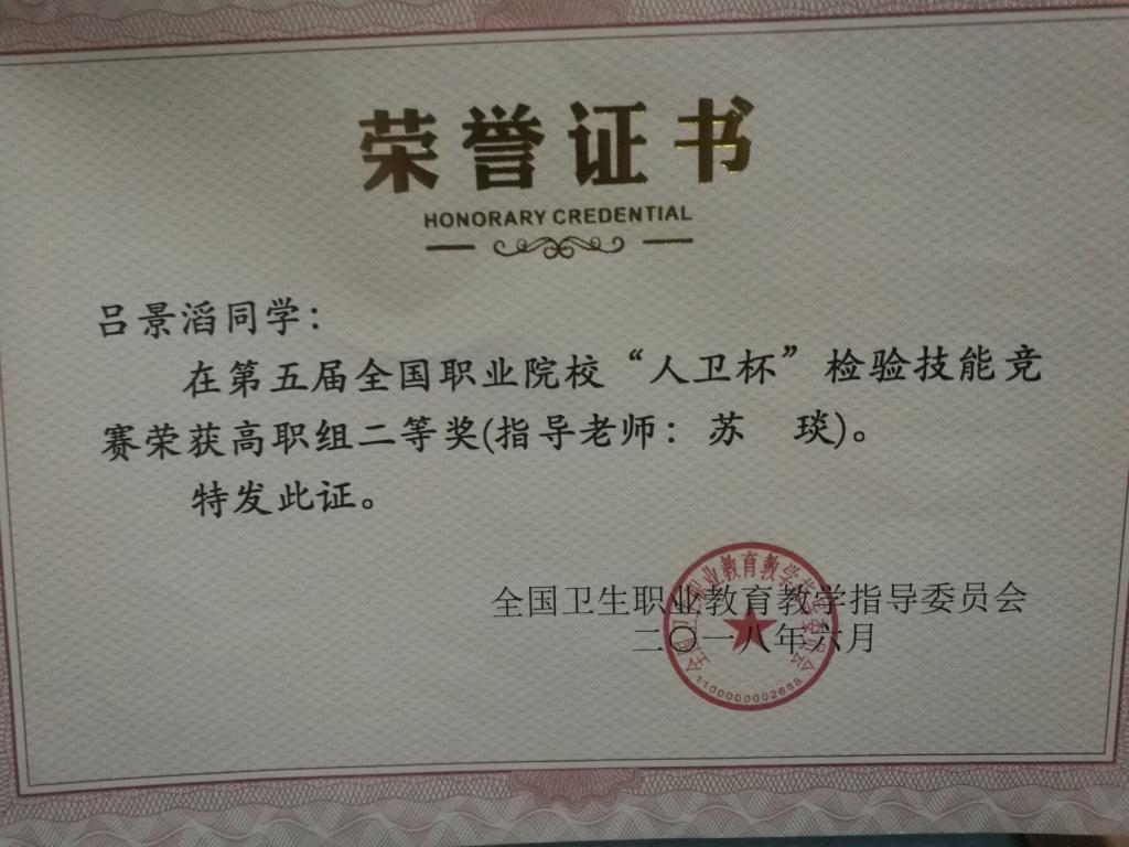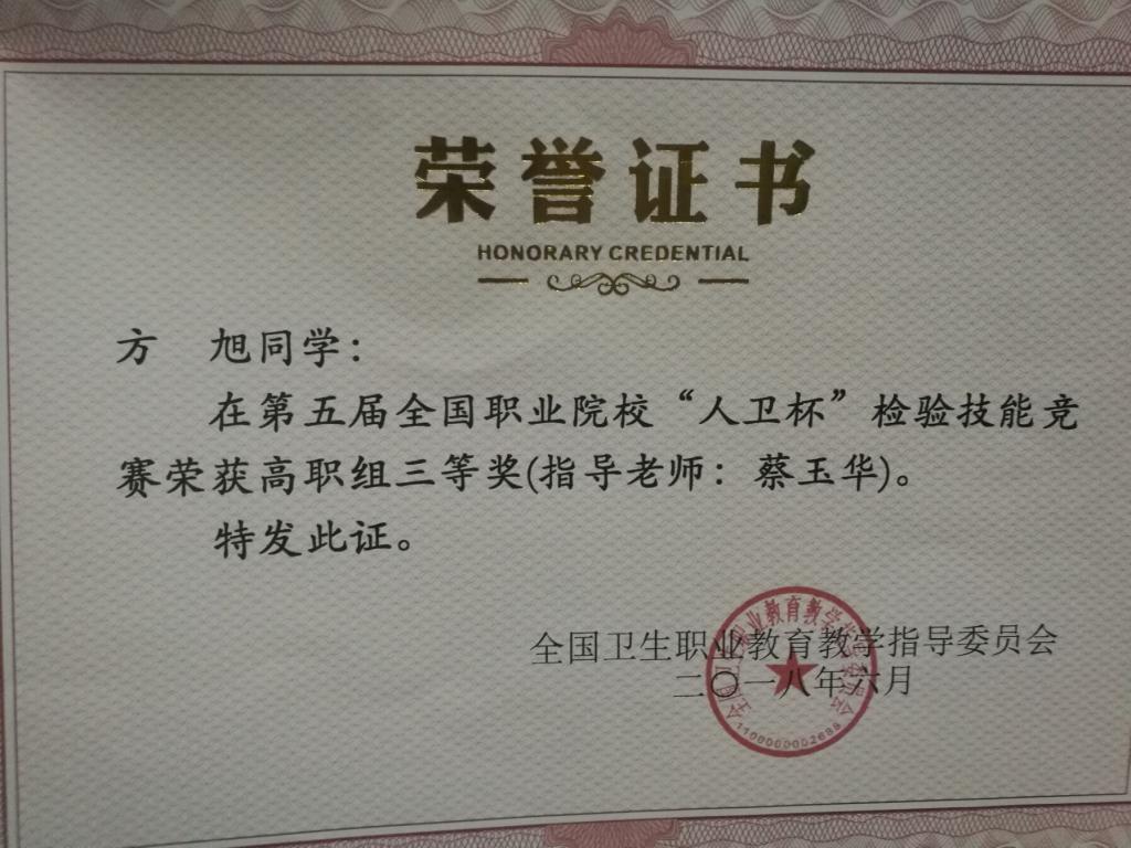 本次竞赛有来自全国各地的110所高(中)职院校派出的120支代表队,361名选手参加,规模空前。其中高职组比赛共四个项目:白细胞计数及临床应用;细菌分离技术、革兰染色法及细菌鉴定思路;血糖测定及临床应用;形态学检验项目。经过三天的激烈角逐,AC米兰官网在91个高职代表队中位列第33名,获团体三等奖。另外吕景滔同学获个人综合二等奖;方旭同学获得个人综合三等奖。