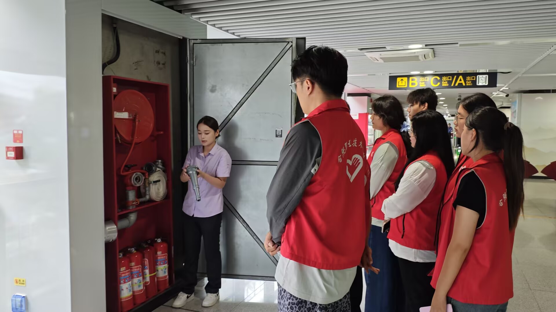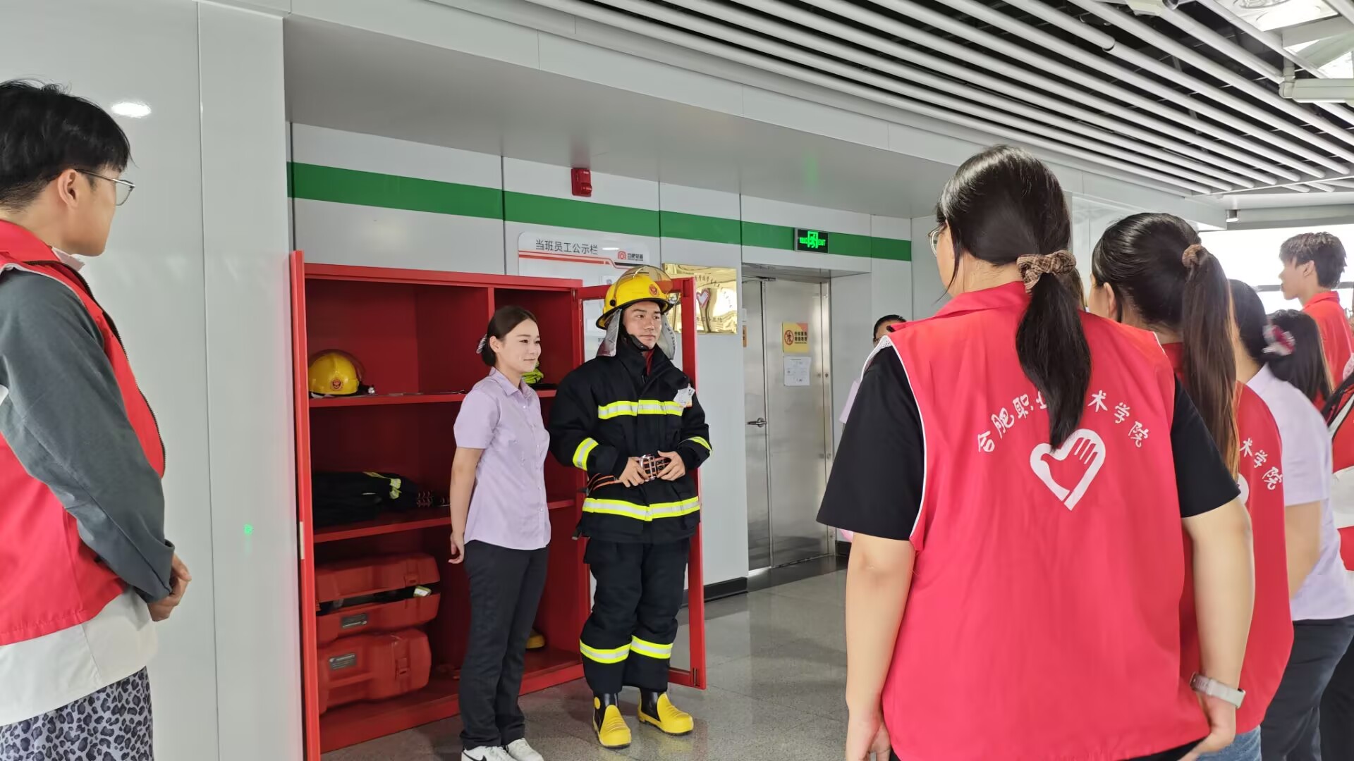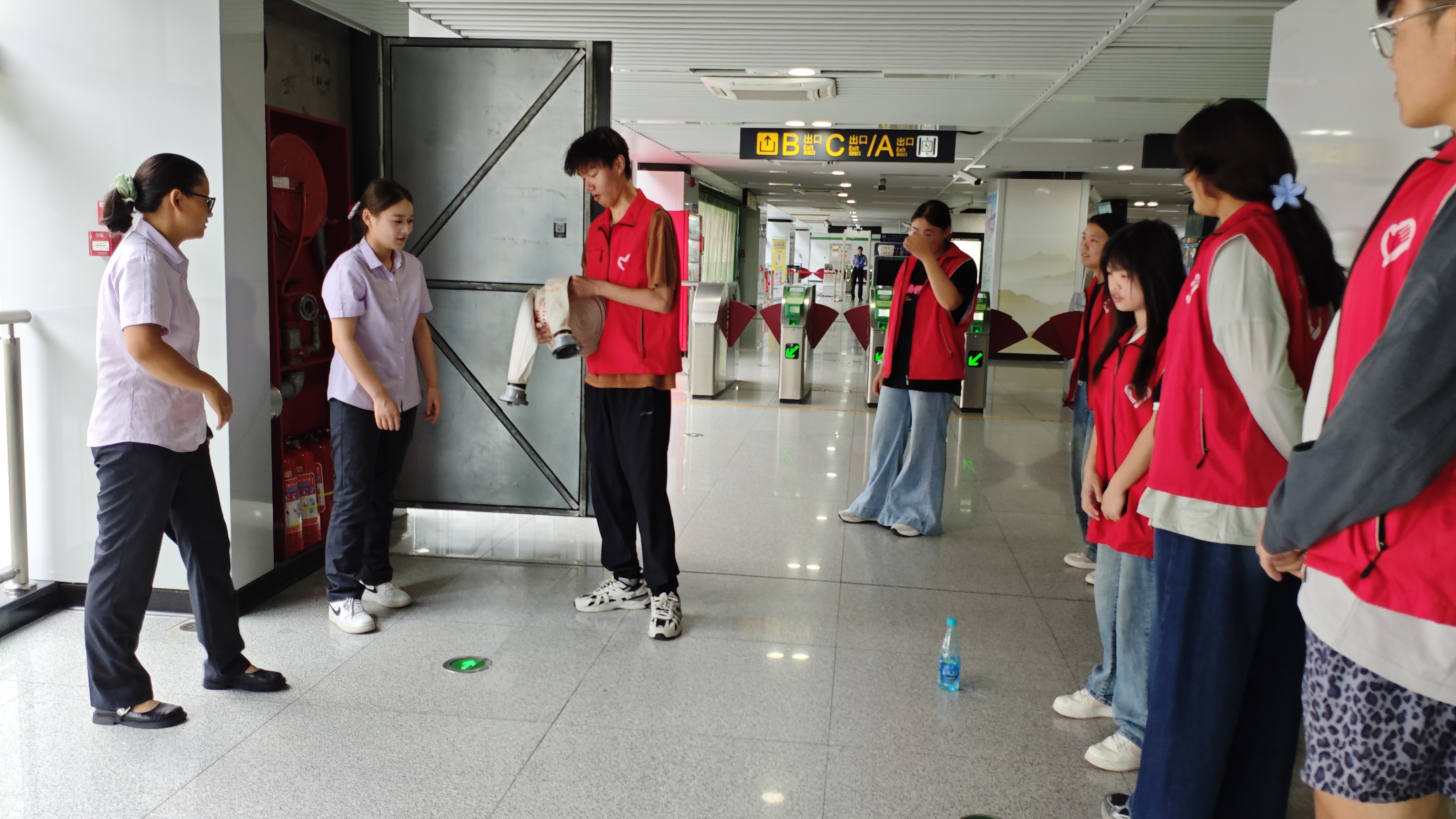 活动中,地铁运营公司安全管理专员先带志愿者熟悉站内消火栓、消防服存放点等设施位置,讲解地铁运营常见安全风险,志愿者认真聆听记录。随后,专员演示心肺复苏流程,展示自动体外除颤器并讲解使用方法与注意事项;还教学干粉灭火器、普通灭火器的“提、拔、握、压”规范操作,指导志愿者掌握消火栓使用方法,两名志愿者实操表现优异。最后,志愿者积极尝试消防服穿戴,均准确完成。