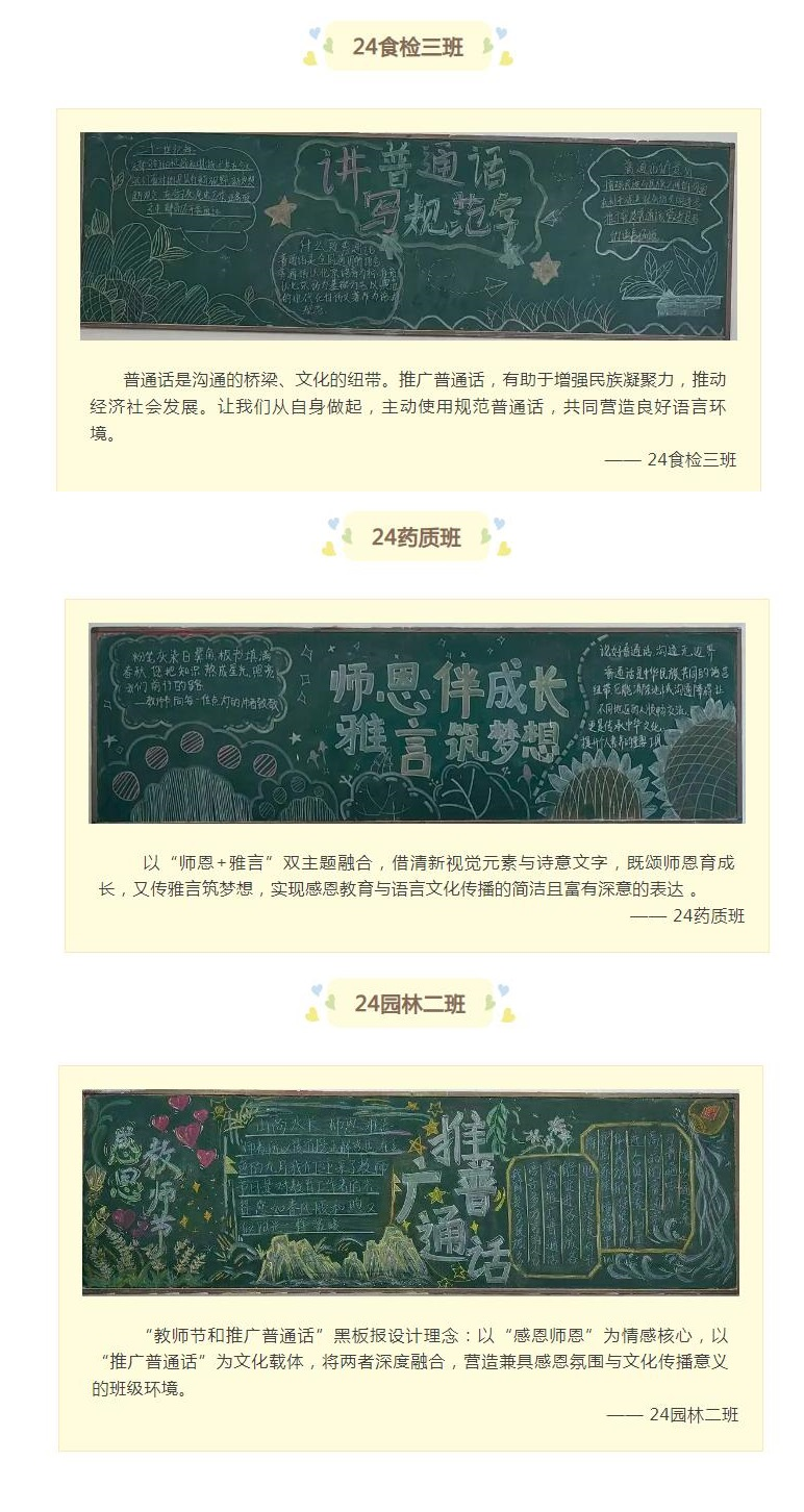 开展推广普通话专题黑板报展示活动。各班级积极响应,精心策划,围绕语言文字的规范使用、中华优秀传统文化的传承等主题,创作出了一批内容丰富、设计精美的黑板报作品。这些作品不仅展示了同学们的艺术才华,更体现了他们对语言文字的热爱和对中华文化的自豪。