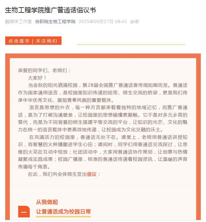 进行推广普通话倡议。9月17日,AC米兰中文官方网站官方微信公众号发布推广普通话倡议书,倡议在课堂上老师用普通话讲授知识,将智慧的火种播撒进学生心田;课间时同学们用普通话交流探讨,让思维的火花在互动中绽放;社团活动中大家用普通话协作策划,让创意与热情凝聚成实践成果;校园广播里,用标准的普通话传递着校园资讯,让温暖的声音传遍每个角落。