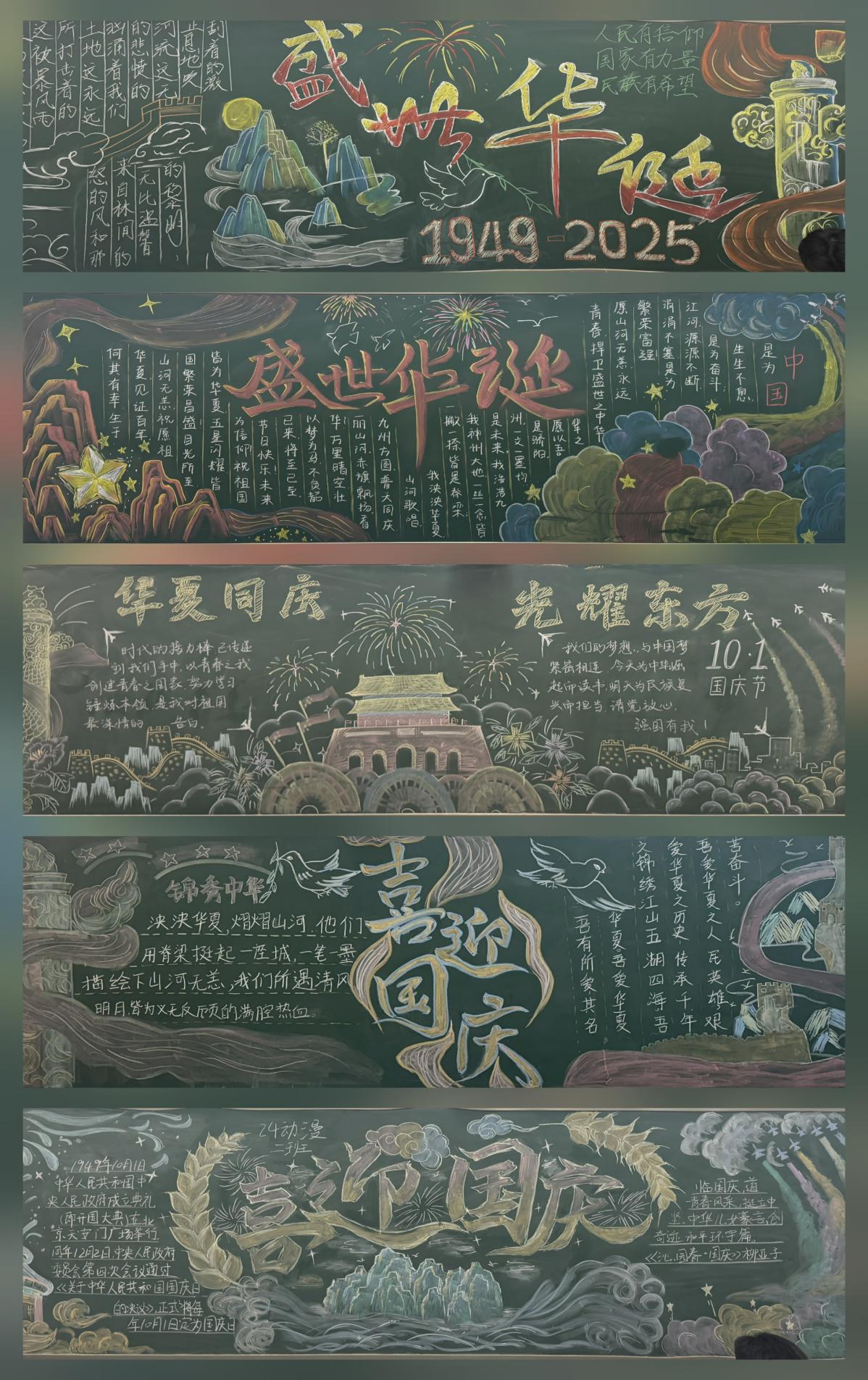 同学们以“迎国庆”为主题绘制黑板报,发挥创意与巧思,用色彩鲜艳的画笔勾勒祖国大好河山,用工整有力的文字书写时代发展成就,从“中国梦”到“科技强国”,从“红色故事”到“青春担当”,每一笔、每一画都饱含对祖国的赞美与祝福,让教室成为传递爱国精神、弘扬时代正能量的生动载体。