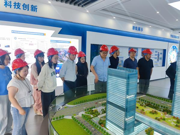 观摩期间,教师团队实地参观智能建造展厅与超高层建筑施工先进工法样板展示区,与项目技术团队深入交流。在智能建造展厅内,教师们系统了解智慧工地云平台的实时数据监测功能,现场体验AI视频语音监控及调度系统的智能协同机制,近距离观摩施工机器人作业流程,并围绕节能检测技术应用场景、AR安全体验系统实操模式展开研讨,直观感受智能建造技术在工程领域的创新实践成效。