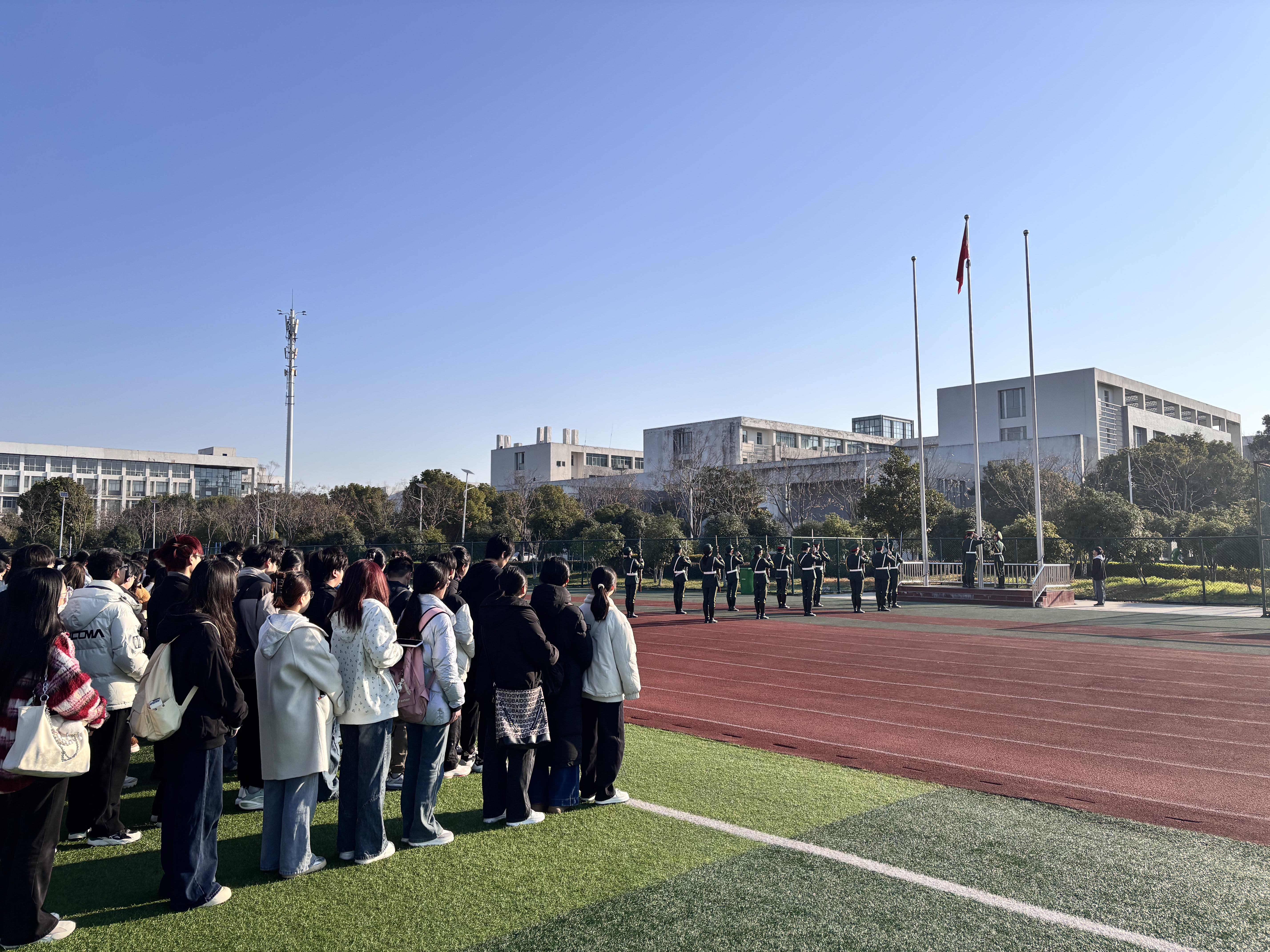 活动第一项,升国旗,奏国歌。国旗护卫队踏着铿锵有力的步伐有序入场,每一步都彰显着昂扬的风貌。迎着清晨的朝阳,五星红旗缓缓展开,在微风中冉冉升起。在场全体同学身姿挺拔如松,目光坚定地追随国旗,以庄重的注目礼,诉说着对祖国最深沉的热爱与最崇高的敬意。