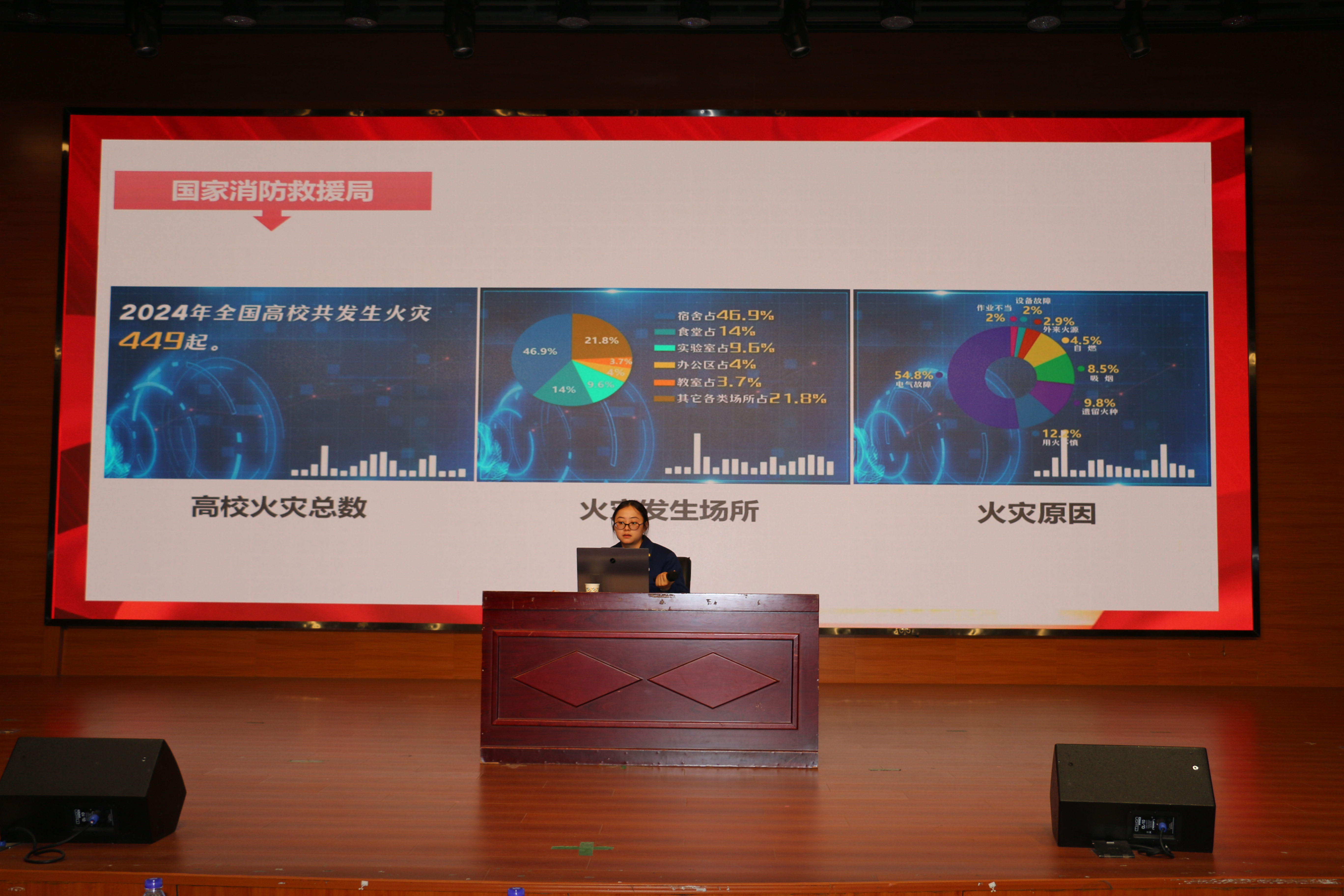随后开展的消防安全知识讲座中,黄指导员结合高校火灾案例,重点讲解实验室、教室、宿舍等场所的火灾隐患。系统讲授了在不同环境下(如高层建筑、宿舍)发生火灾时的逃生策略,包括如何正确报警、如何选择逃生路线、如何防烟避险等关键技巧。黄指导员通过展示近年来发生的典型火灾案例视频和图片,以触目惊心的真实场景和惨痛教训,瞬间抓住了全场听众的注意力,深刻揭示了“隐患险于明火,防范胜于救灾”的严峻现实。