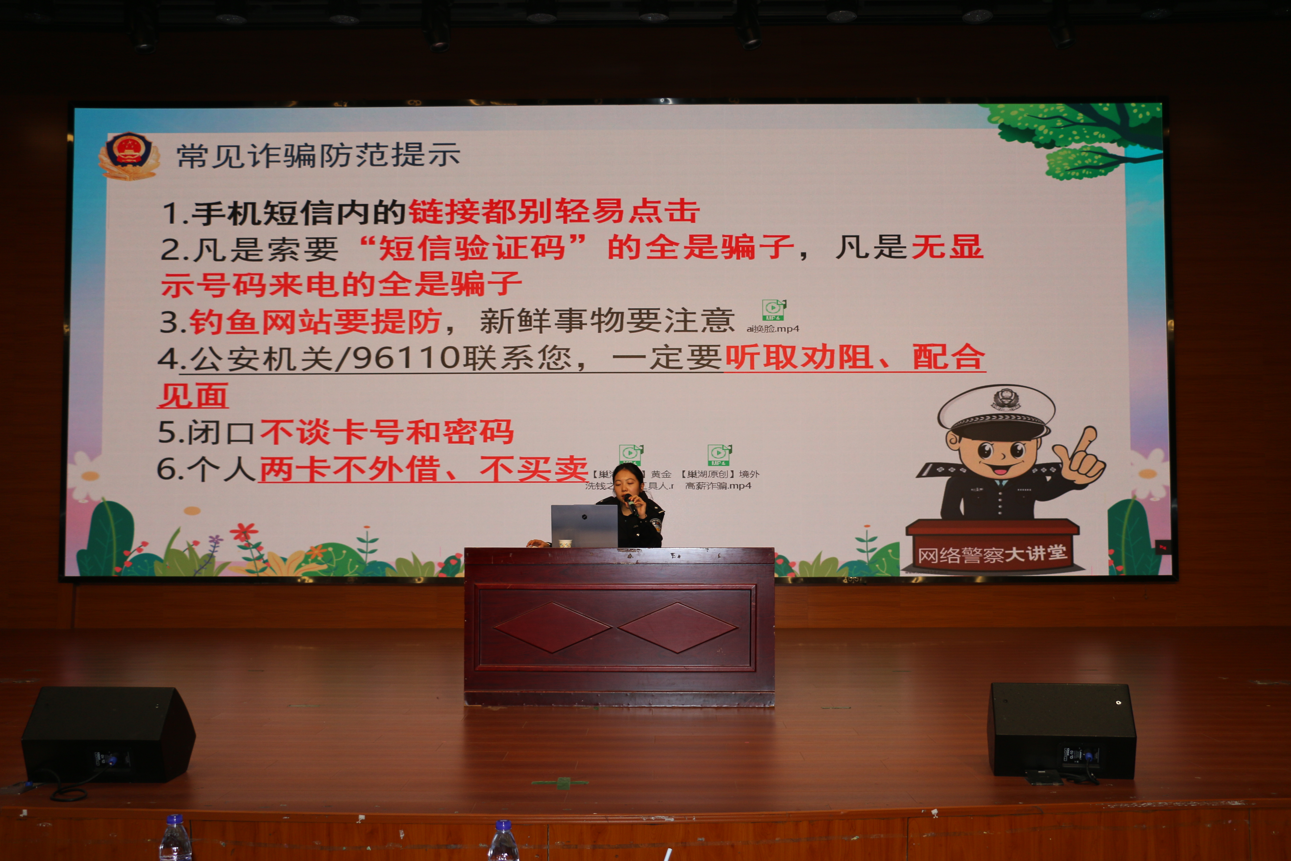 罗警官以 “识破诈骗套路,守护青春财富” 为主题展开讲解。她以近期高发的真实案例为切入点,用通俗易懂的语言拆解了学生群体易遭遇的诈骗类型,如:“高薪兼职”“冒充公检法”“刷单返利”“AI换脸”“伪造邮件”“游戏交易”……她提醒学生交易、求职都应通过官网、正规平台核实信息,拒绝缴纳“入职保证金”“培训服务费”等不合理费用。
