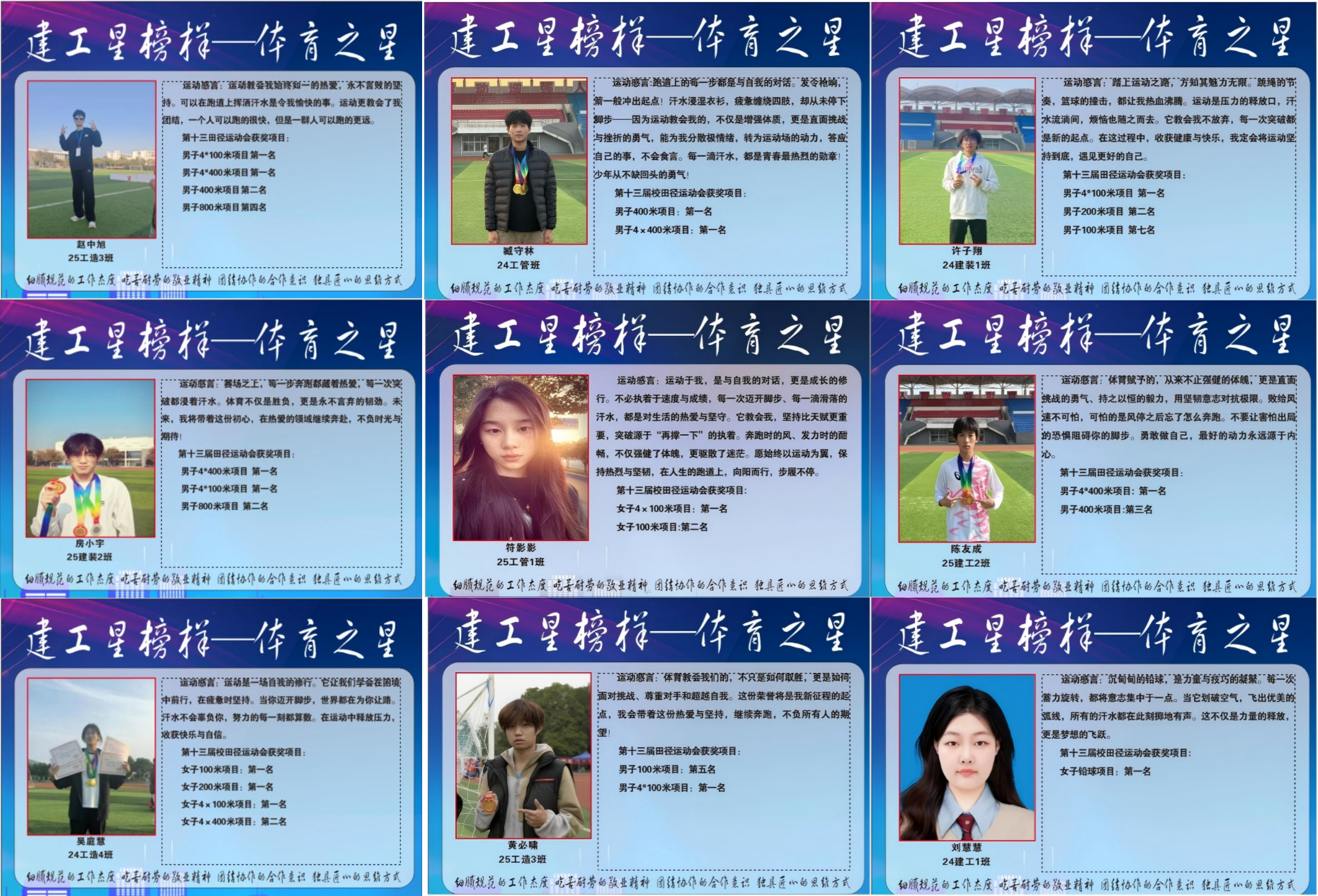 为进一步发挥先进典型的示范引领作用,激发广大学生参与体育锻炼的热情,营造“比学赶超、奋勇争先”的校园氛围,近日,建筑工程学院成功举办“建工星榜样——体育之星”评选活动。本次活动主要依据AC米兰官网第十三届田径运动会中建工学院运动健儿们的竞技表现与得分情况,经过综合评议,最终评选出9名成绩突出的运动员,授予“体育之星”荣誉称号。他们分别是:25工造3班赵中旭、25建装2班房小宇、24工造4班吴庭慧等同学。他们在赛场上挥洒汗水、顽强拼搏,不仅为学院赢得了荣誉,更充分展现了建工学子昂扬向上、奋发有为的精神风貌。