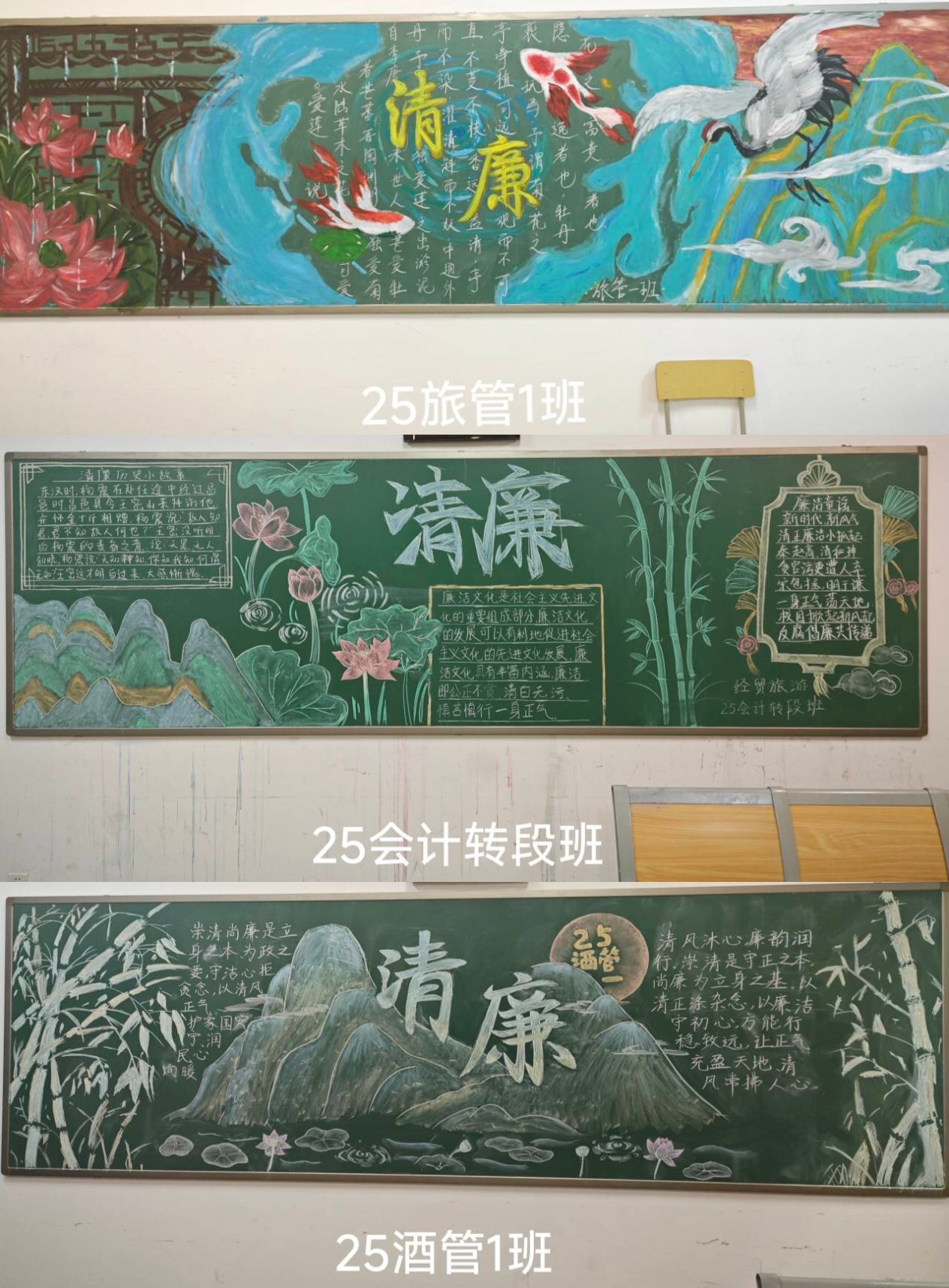 廉洁主题黑板报活动中,同学们将廉洁精神与经贸旅游专业特色深度融合,以粉笔触勾勒廉洁典故,用图案解读清风内涵,一幅幅主题鲜明、版式新颖的黑板报,不仅成为班级文化的“风景线”,更让大家在构思创作中深化了廉洁认知,厚植了自律自觉。
