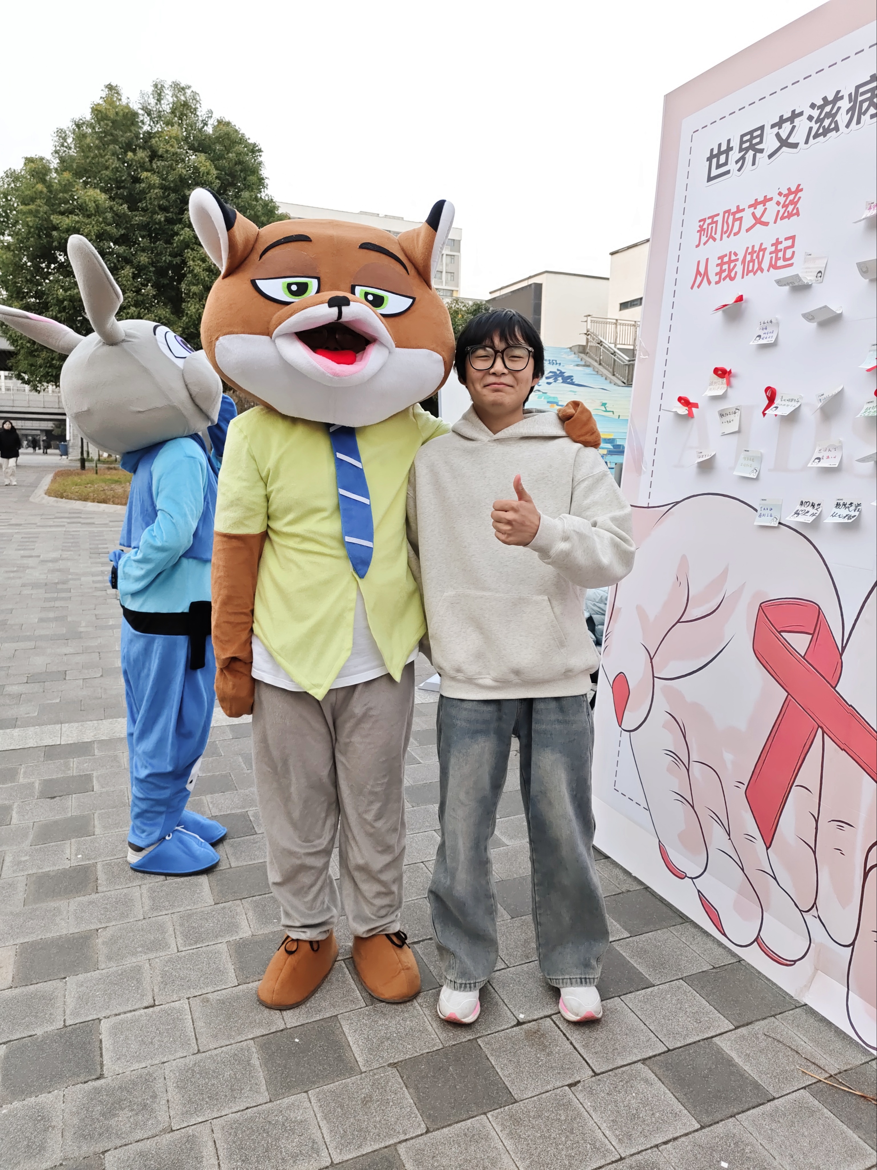 “艾”知问答摊位前人气高涨,以趣味问答普及防艾知识,题目涵盖传播途径、预防措施及反歧视理念等核心内容。参与同学答对5题中的3题可获精美礼品,未达标者也能获得参与奖。志愿者针对易错题目现场讲解,帮助同学们纠正认知误区,在轻松互动中巩固防艾知识。暖心贴语摊位前满含温情,参与者领取便签纸书写对艾滋病患者的祝福、寄语或反歧视倡议,随后张贴至留言板。一张张承载善意的便签组成“爱心墙”,生动传递了“尊重与关爱艾滋病患者”的活动理念。健康承诺摊位前,同学们有序宣读健康主题标语,以庄重誓言彰显防艾决心。宣读完毕后,志愿者为大家发放象征防艾的红丝带,同学们佩戴或粘贴于留言便签,共同许下守护健康、拒绝歧视的承诺。暖拥萌伴摊位氛围温馨,身着玩偶服饰的工作人员与同学们拥抱互动。服饰上的关怀标语与温暖拥抱相呼应,打破隔阂、消解恐惧,让“关爱接纳”的理念在互动中传递。