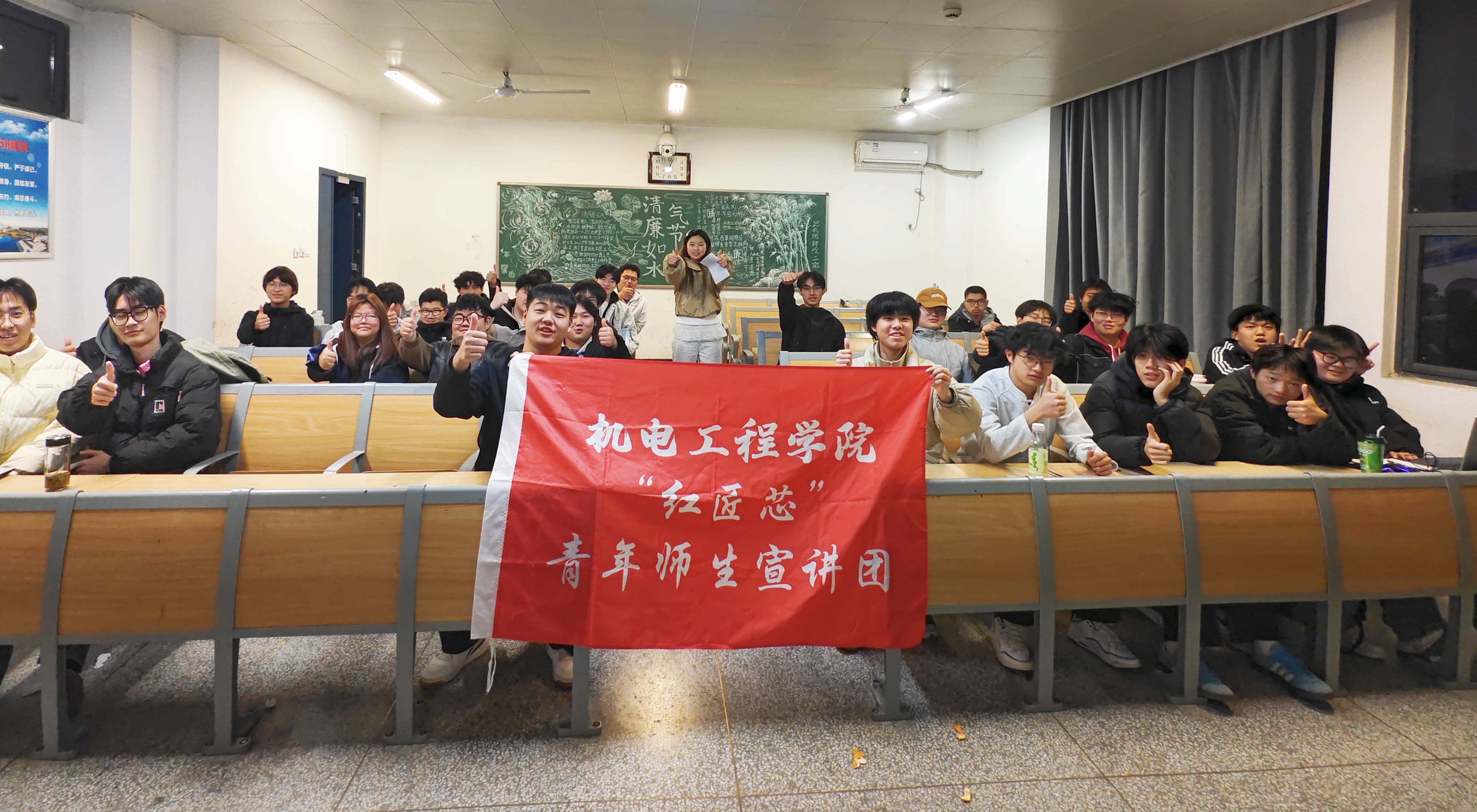 为强化党的创新理论武装、促进校园文化建设,经过精心准备,近日,机电工程学院“红匠芯”青年师生宣讲团以“红色基因传薪火,匠心青春绘蓝图”为主题,开展了2025年度“班级教育+宣讲”系列活动。宣讲团围绕七大主题累计开展54场专题宣讲,覆盖全部新生班级。