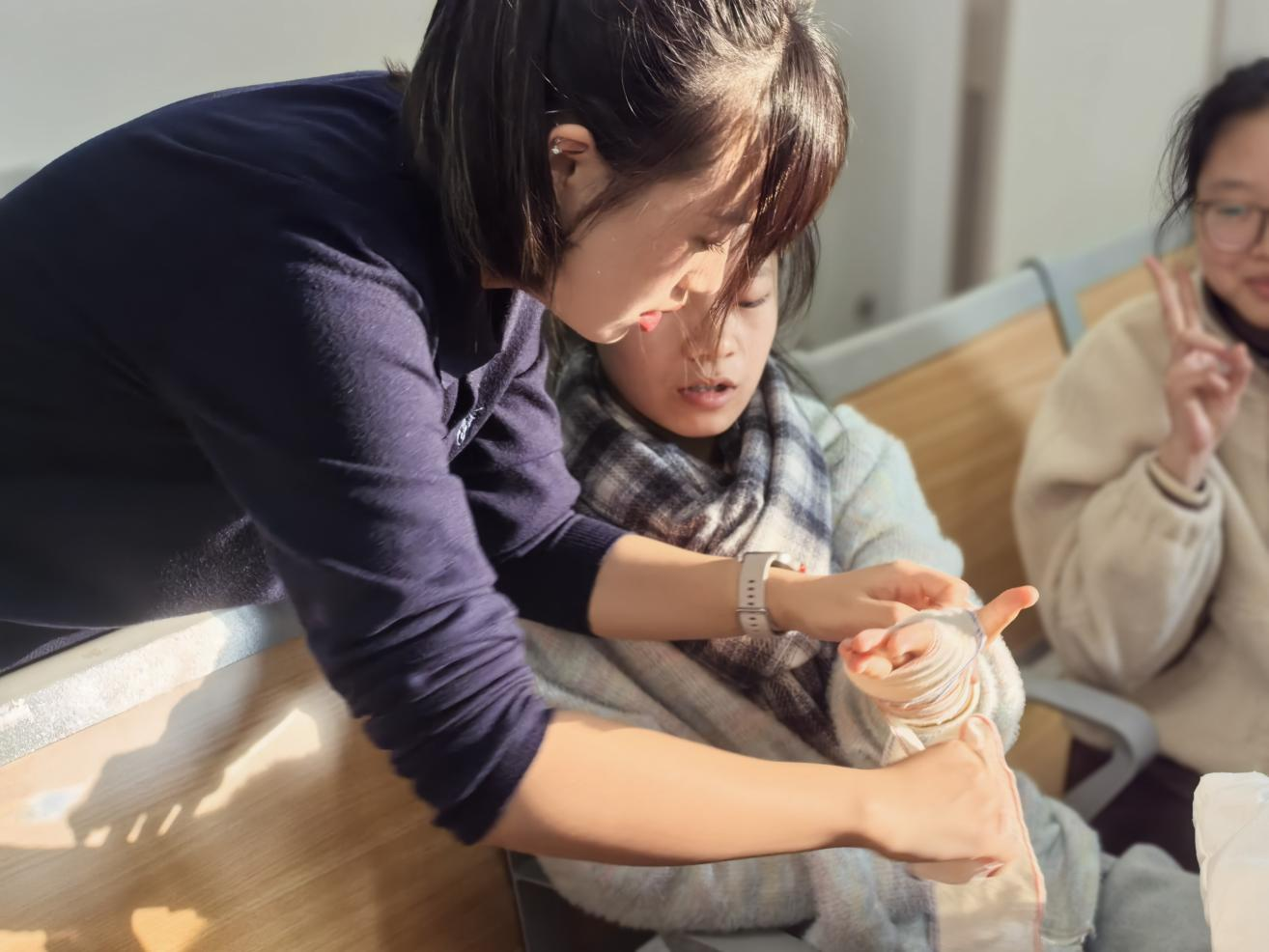 随后,李展同学聚焦健身过程中易受伤的部位,带来运动绷带使用的实操教学。她详细拆解了“清洁准备、交叉缠绕、调整松紧、牢固固定”四大核心步骤,重点强调绷带缠绕的松紧度需兼顾支撑性与舒适度——过紧易影响局部血液循环,过松则无法发挥有效的保护作用。在一对一指导环节,李展同学耐心观察每位同学的操作手法,及时纠正不规范动作,确保大家都能熟练掌握运动绷带的正确使用方法。