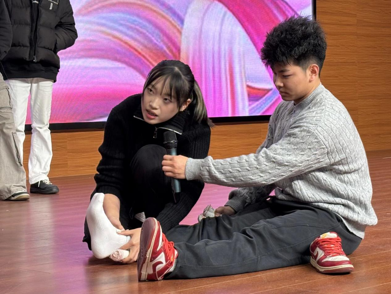 随后,医学生志愿者分组开展“情景化”演示,将“黄金四分钟”“RICE原则”等关键知识转化为可视、可触、可重复的操作记忆,现场同学轮番上场体验,掌声此起彼伏,气氛热烈。同时开展的互动游戏把运动安全要点嵌入趣味规则,同学们在“玩中学、学中用”,潜移默化完成从“知道”到“做到”的跨越。25工造3班的葛新继同学表示:“原以为安全讲座很枯燥,没想到全程高能,下次遇到突发情况,我至少不会手足无措。”