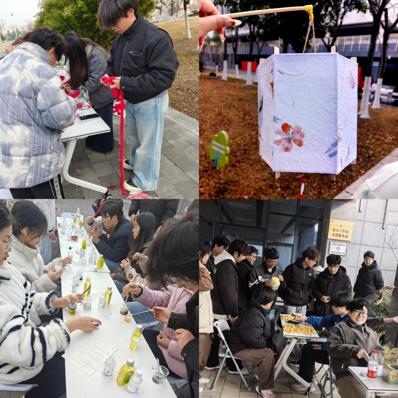 活动现场热闹非凡,三大板块活动各具特色,吸引众多同学热情参与。棋类竞技区里,飞行棋赛场充满欢声笑语,选手们紧盯骰子点数,为每一次前进欢呼雀跃;象棋对弈区则气氛紧张,选手们沉着思考、谨慎落子,在楚河汉界间展开激烈的脑力博弈,尽显棋艺与智慧。手工创作区中,中国结编织与迎春灯笼制作活动热闹非凡,同学们跟着学习编织技巧,穿线、打结、塑形,一根根彩绳在手中变成精美别致的中国结,一张张彩纸化作喜庆的灯笼,承载着大家对新年的美好期许。自制护肤品体验区人气高涨,在专业同学的讲解示范下,同学们了解天然原料的功效,亲手调配护手霜等护肤品,在实践中感受手工制作的乐趣与成就感。