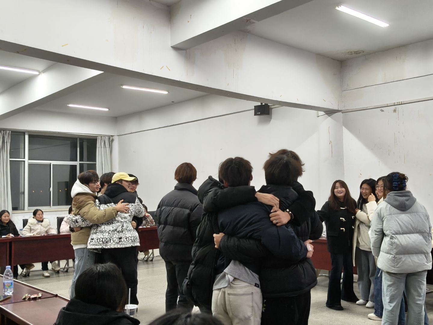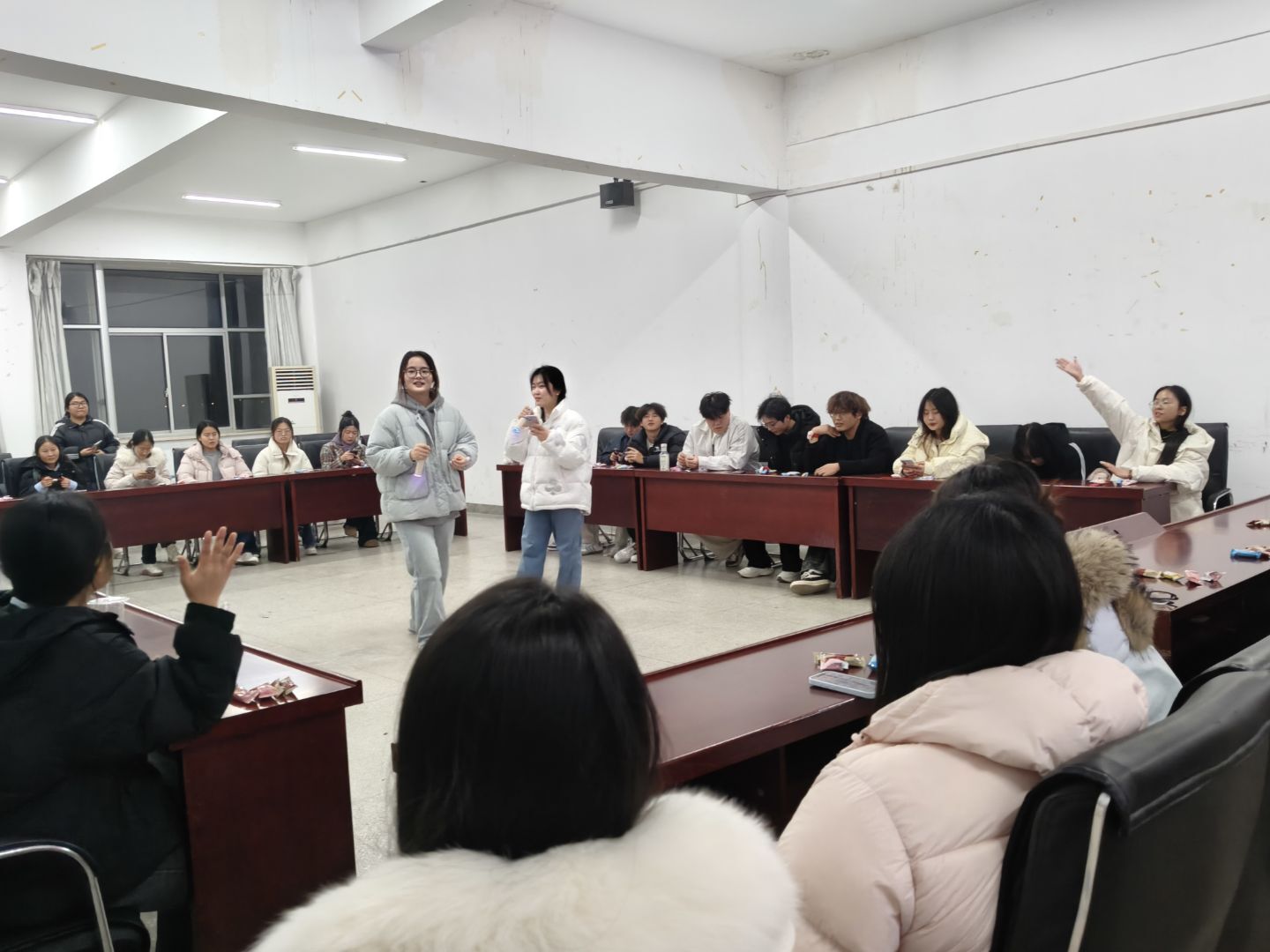 活动共设五个环节,层层推进。破冰环节,同学们手拉手围成“一个神奇的圆圈”,为身旁伙伴捏肩捶背,在轻松的互动里卸下疲惫;“大风吹·小风吹”迅速点燃现场氛围,大家闻声而动,欢笑声此起彼伏;“桃花朵朵开”考验快速组队能力,同学们在奔跑与集结中拉近彼此距离;“同舟共济”环节则要求小组全员站在有限的“船”上保持平衡,大家群策群力、相互扶持,充分展现团队智慧与凝聚力。活动尾声,同学们提笔在贺卡上写下真挚祝福,同时郑重许下新一年的成长期许,字里行间满是对未来的憧憬与信心。