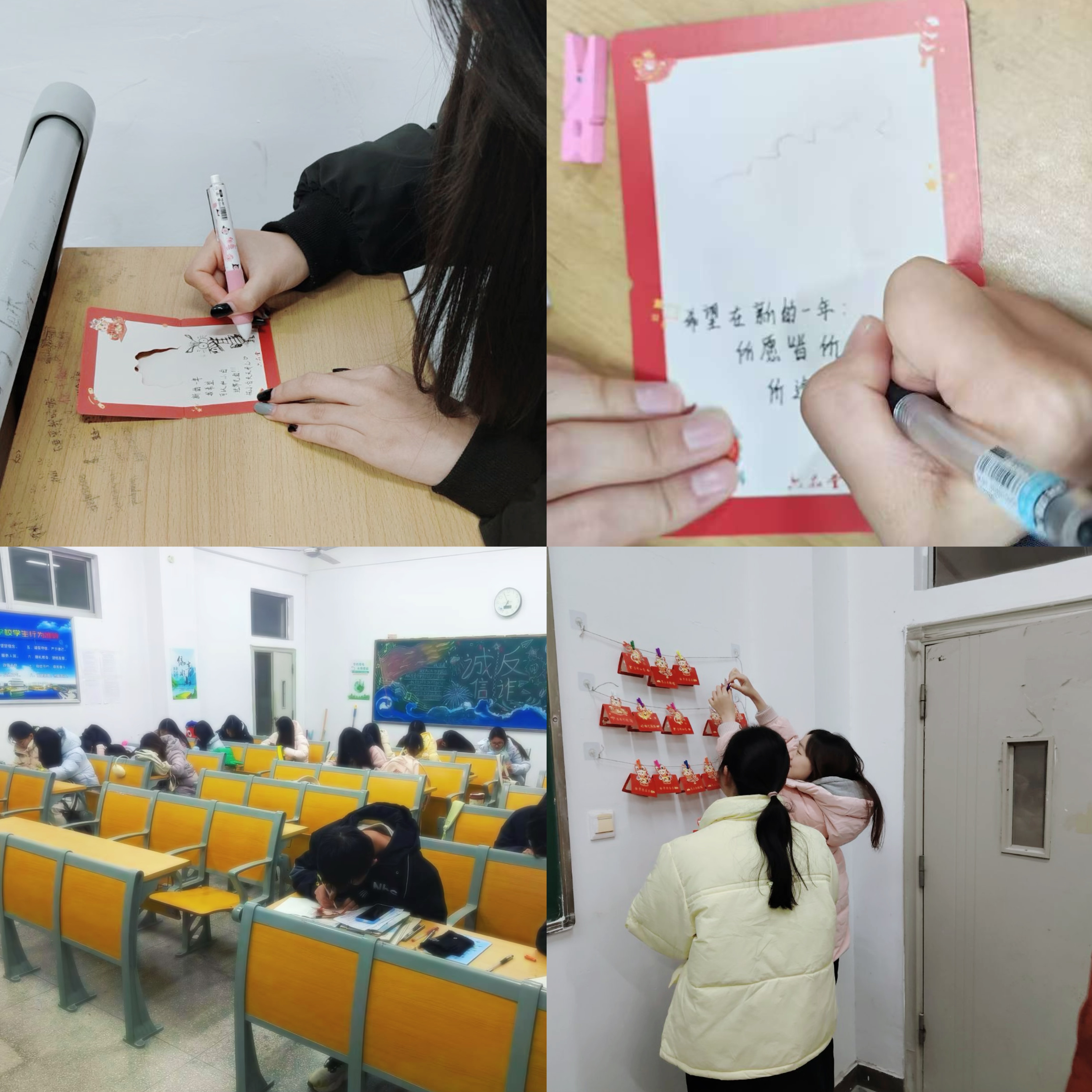 活动设置“新年愿望墙”与“福字拓印”两大特色环节。在“新年愿望墙”环节,同学们在精美的卡片上执笔抒怀,将学习进步的目标、成长蜕变的期许、情感生活的愿景凝于笔端,一字一句皆是青春心声的真挚流露;“福字拓印”环节中,同学们动手实践,将一个个兼具艺术之美和良好祝愿的“福”字拓印到宣纸上,在宣纸与印泥的交融间感受传统文化的独特魅力。活动结束后,承载着美好祝愿的愿望卡片与福字拓印作品,被精心布置在各班教室与宿舍公共区域,成为装点校园的一道独具温度的文化风景线。