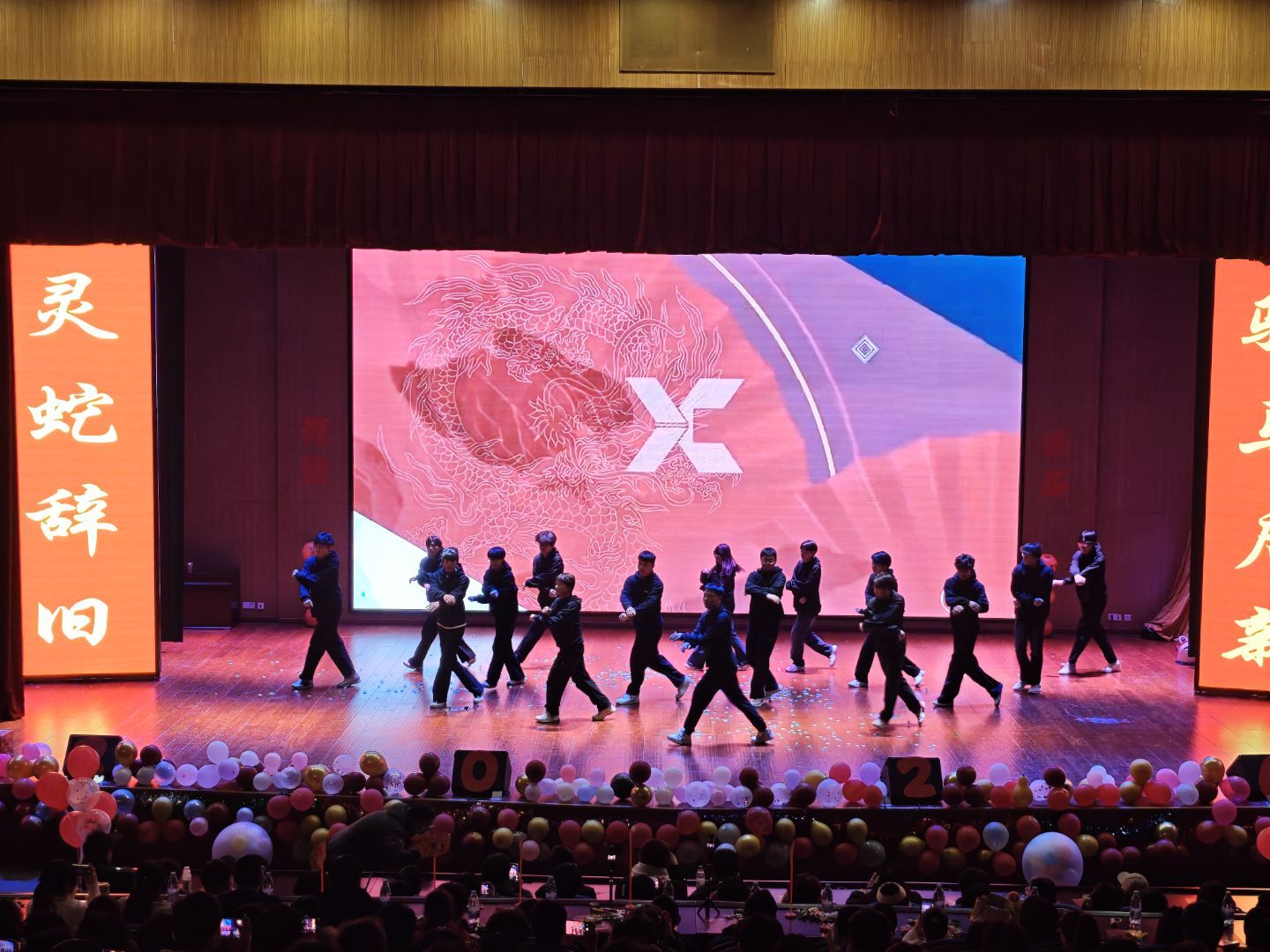 随着节日序曲奏响,舞台灯光骤然亮起——25 级全体班长的舞蹈串烧《Trouble maker+本草纲目》拉开晚会序幕,动感舞步衔接国风韵律瞬间引爆全场。紧接着《无名的人》的温柔合唱、《诈骗局中局》的反诈小品、《青花瓷》的清雅唱腔轮番登场,或共情或逗趣的表演让现场氛围持续升温;互动环节一结束后,《红昭愿》的国风舞姿、《宫廷膳食失窃案》的古装喜剧、《男孩》的青春合唱,以及贴近校园生活的《考试还剩15分钟》小品,接连将欢乐推向顶峰。