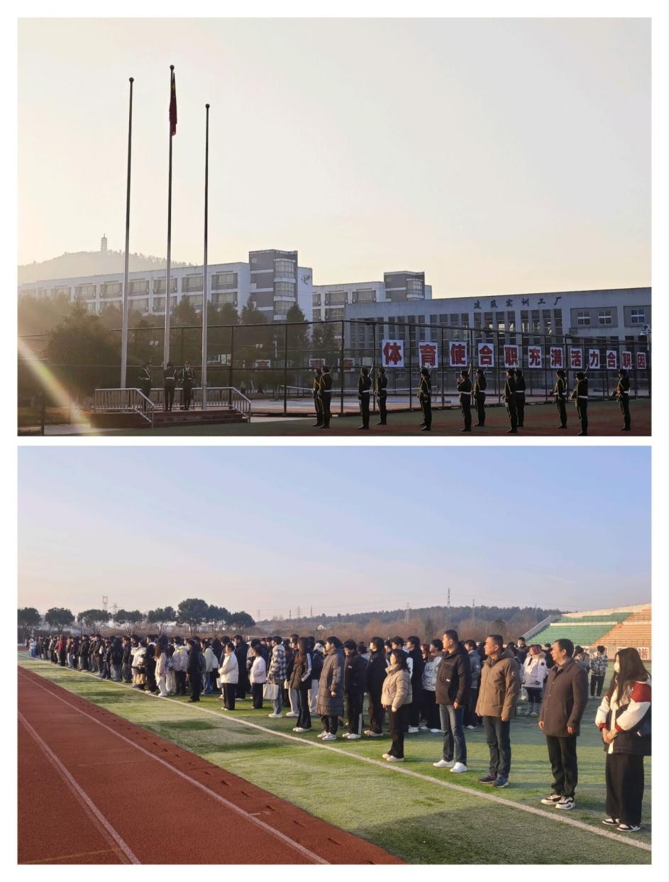 冬日的晨光洒满校园,操场上秩序井然,全体师生精神饱满、肃然而立。伴随着激昂雄壮的《义勇军进行曲》,护旗手迈着铿锵有力的步伐护送五星红旗入场,在全体师生的注目下,鲜艳的五星红旗冉冉升起、迎风飘扬。嘹亮的国歌声中,每一位师生都怀着对祖国的崇高敬意,歌声里饱含着奋进向上的力量。
