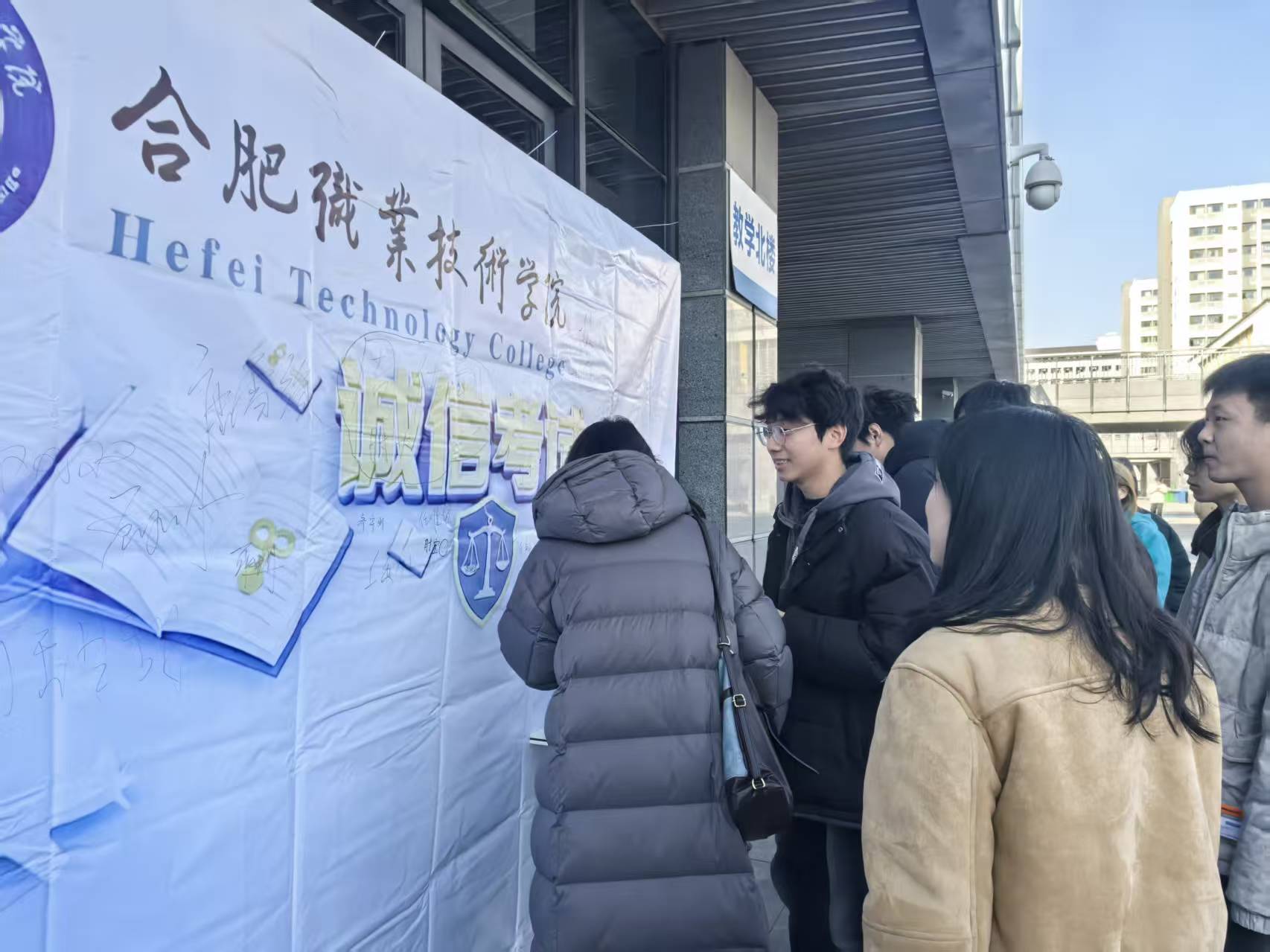 1月7日下午,为迎接即将到来的期末考试,进一步弘扬诚信考试之风,校学生会在北教学楼前广场成功举办了以“以诚信之笔,答青春考卷”为主题的诚信教育签名活动。本次活动面向全校学生,旨在强化同学们的诚信意识,营造公平、公正、公开的考试氛围。