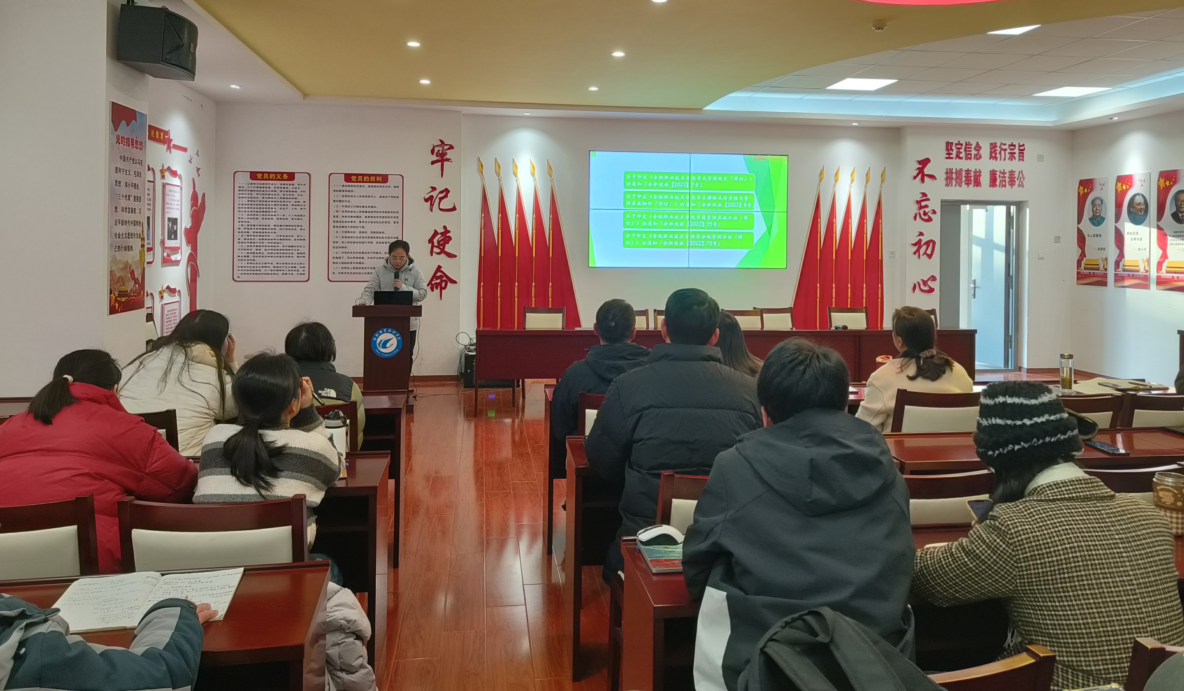 1月12日下午,经贸旅游学院在党性体验馆组织召开1月份政治理论学习会暨全体教职工大会,系统学习近期重要会议精神与工作部署。会议由副院长付晓兰主持,该院全体教职工参会。