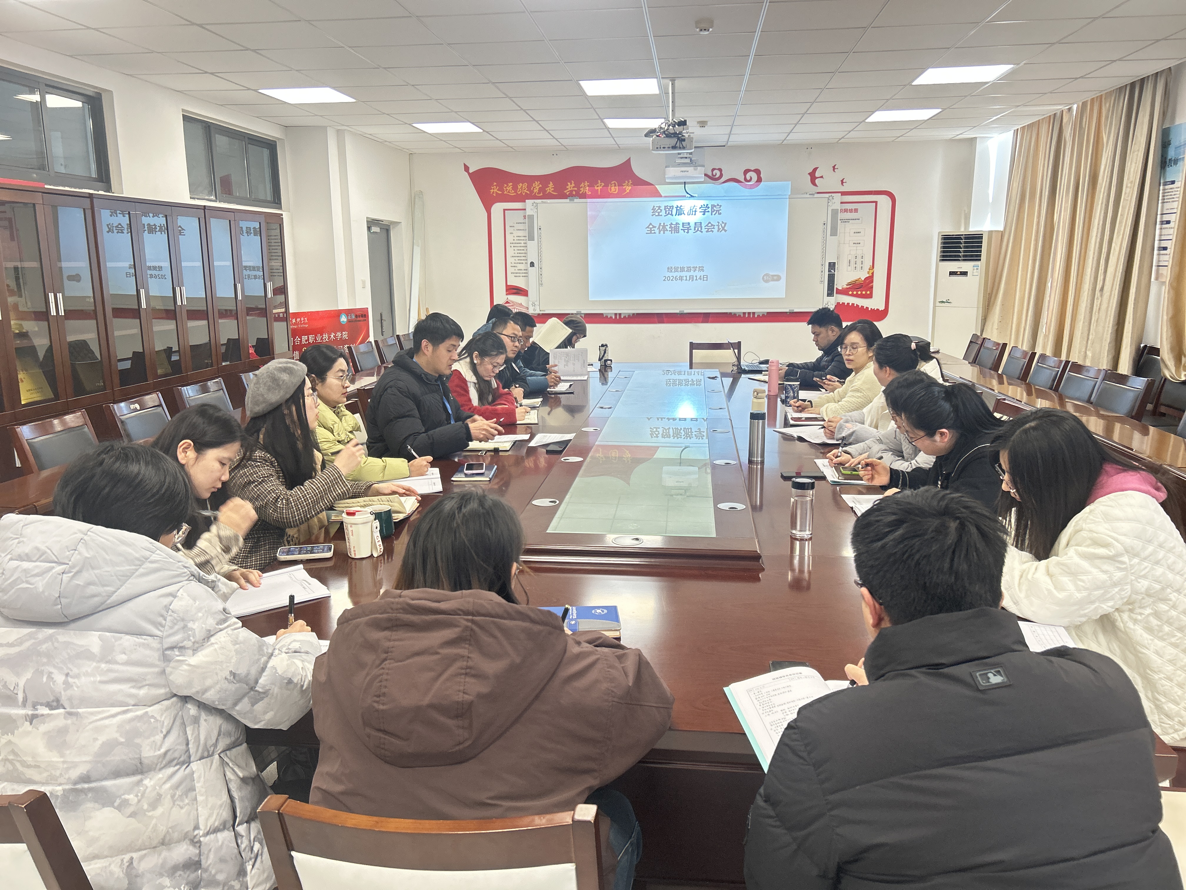 为深入总结2025-2026学年第一学期学生工作情况,进一步强化思想政治教育与学生日常管理,安排期末及寒假期间重点工作,经贸旅游学院于1月14日下午在该院305会议室召开全体辅导员工作会议。该院党总支副书记赵倩倩及全体在校班级专兼职辅导员参加会议。