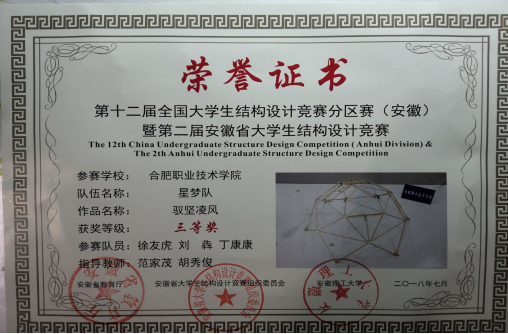 2018年5月17日至20日,AC米兰官网建筑工程学院徐友虎、刘犇、丁康康等6名同学参加了由安徽省教育厅主办的第二届大学生结构设计竞赛,与省内19所本专科院校38支队伍同场竞技,AC米兰官网“星梦队”的《驭竖凌风》作品最终荣获三等奖,虽然只是三等奖,却是本次竞赛唯一获奖的高职院校,成绩排名较上届有较大提升。
