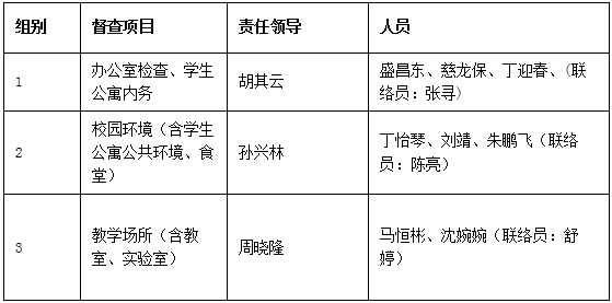 2、5月23日下午4:30,由校领导督查各工作组检查开展情况,具体分工如下: