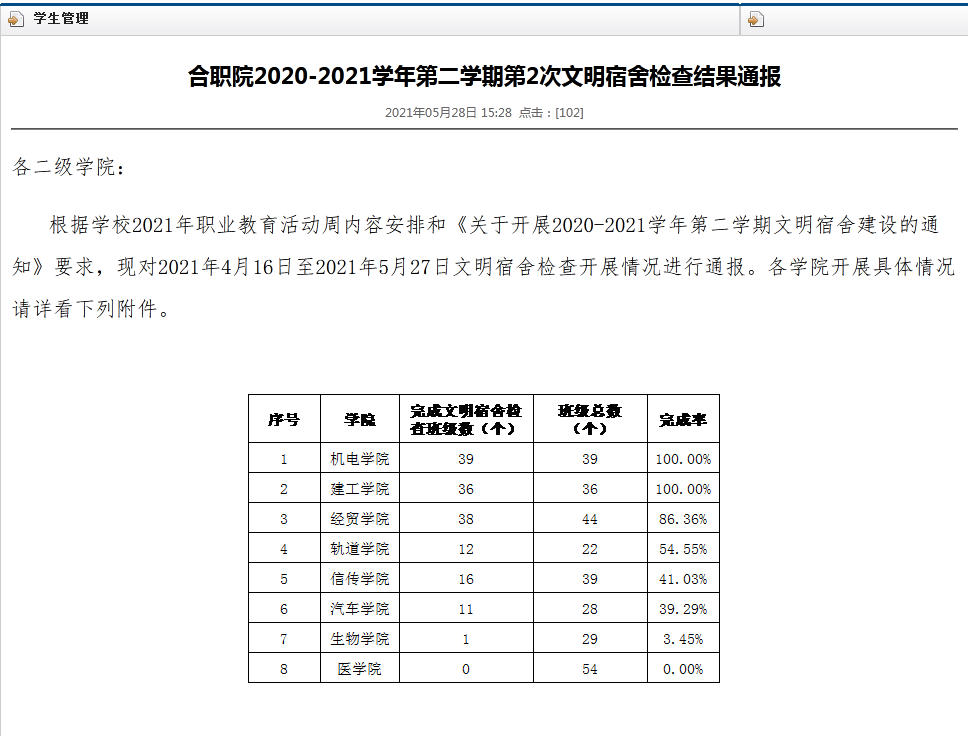 通报建设结果。学生处按照活动内容要求,对文明宿舍建设结果按时通报,利用通报表彰先进,督促后进,促进文明宿舍建设长远持久、更具实效。