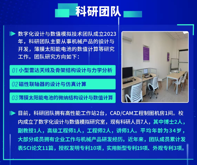 2022年底通过博士人才引进,吴睿成为AC米兰官网机电工程学院的一名专任教师,从科研院所到职业院校,他秉持从零开始。在承担教学工作之外,积极探索思考“职业教育,需要什么样的科研?”。答案是职业教育需要以应用研究为核心、以解决实际问题为导向、产教深度融合的科研体系。2023年他成立了数字化设计与数值模拟技术团队,主要从事机械产品的设计与开发和薄膜光伏电池的技术研究。2023-2024年期间,先后主持AC米兰中文官方网站人才项目1项、产学研项目1项、安徽省高校自然科学研究重点项目1项和企业横向课题4项,另外参与各类教科研项目10余项。吴睿在完成学校教学科研任务的同时,还积极投身企业博士后工作站的研究工作。通过博士后工作站搭建了校企合作的桥梁,成功签订了横向课题1项和申报省级质量工程校企合作生产性共建共享实训基地1项。在他的带领下,科研团队在两年内不断摸索和磨合,初见成效。