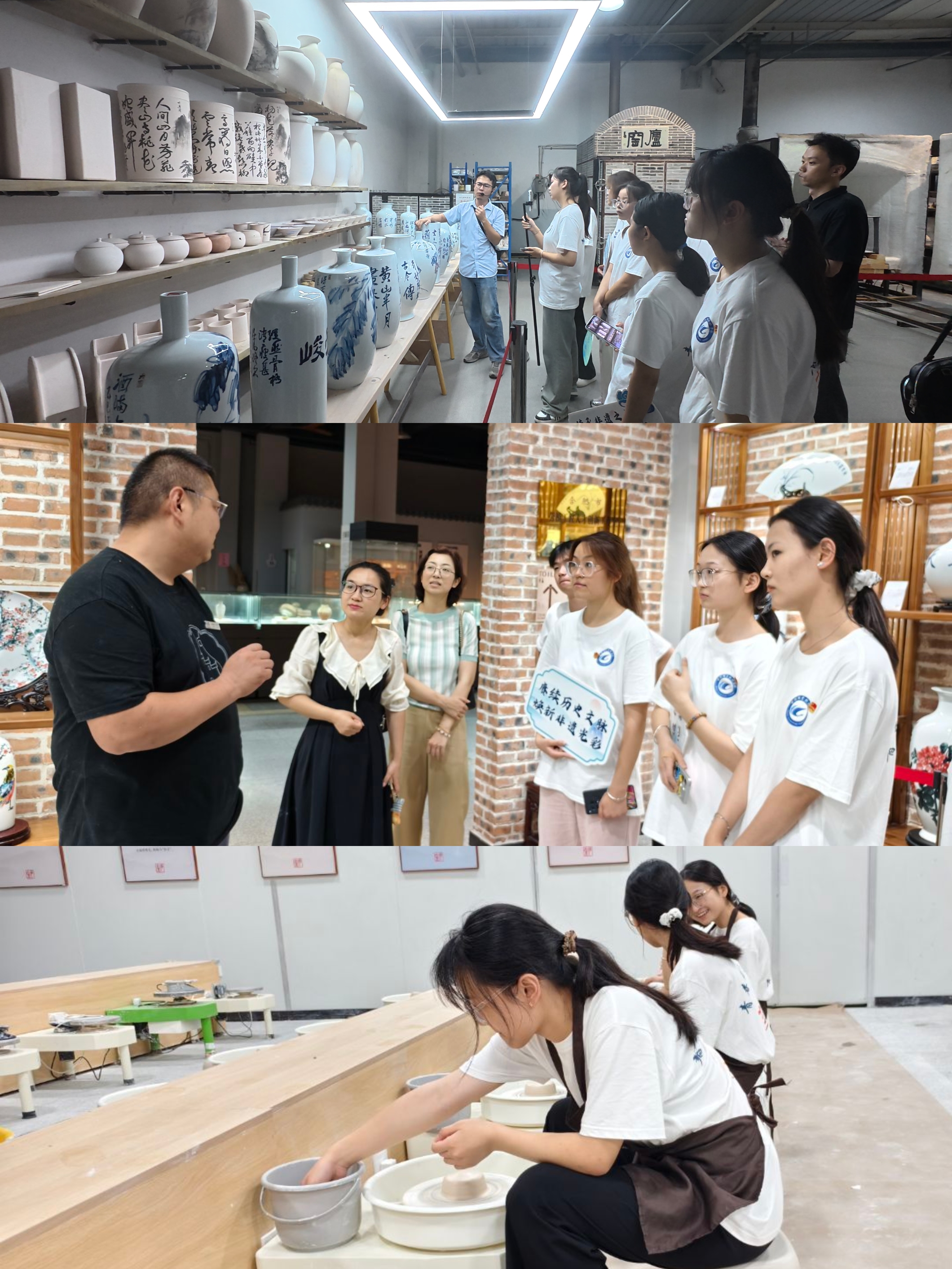 传承:探寻千年庐窑,赓续匠心文脉。6月26日,实践团队的最后一站探访了合肥市非物质文化遗产“庐州窑”,团队成员电商专业的学生运用自己的专业技能对本次探访开启了直播。在传承人吴云龙师傅的带领下,队员们走进庐州窑文化体验馆,聆听庐州窑的辉煌历史、独特工艺及陶艺创作意义。吴师傅不仅为我们介绍了珍贵的古瓷器和现代创新作品,还带领队员们进行沉浸式陶瓷制作体验。揉泥、拉坯、修坯……看似简单的步骤在亲自动手中变得充满挑战。看着转盘上坯体形态的微妙变化,一位同学兴奋地说:“这是我第一次亲手制作陶瓷,感受到了泥土的温度和传统文化的魅力,我一定要把这份体验分享给更多人。”通过访谈、体验,队员们对陶瓷文化的理解更加深刻,热爱之情油然而生。
