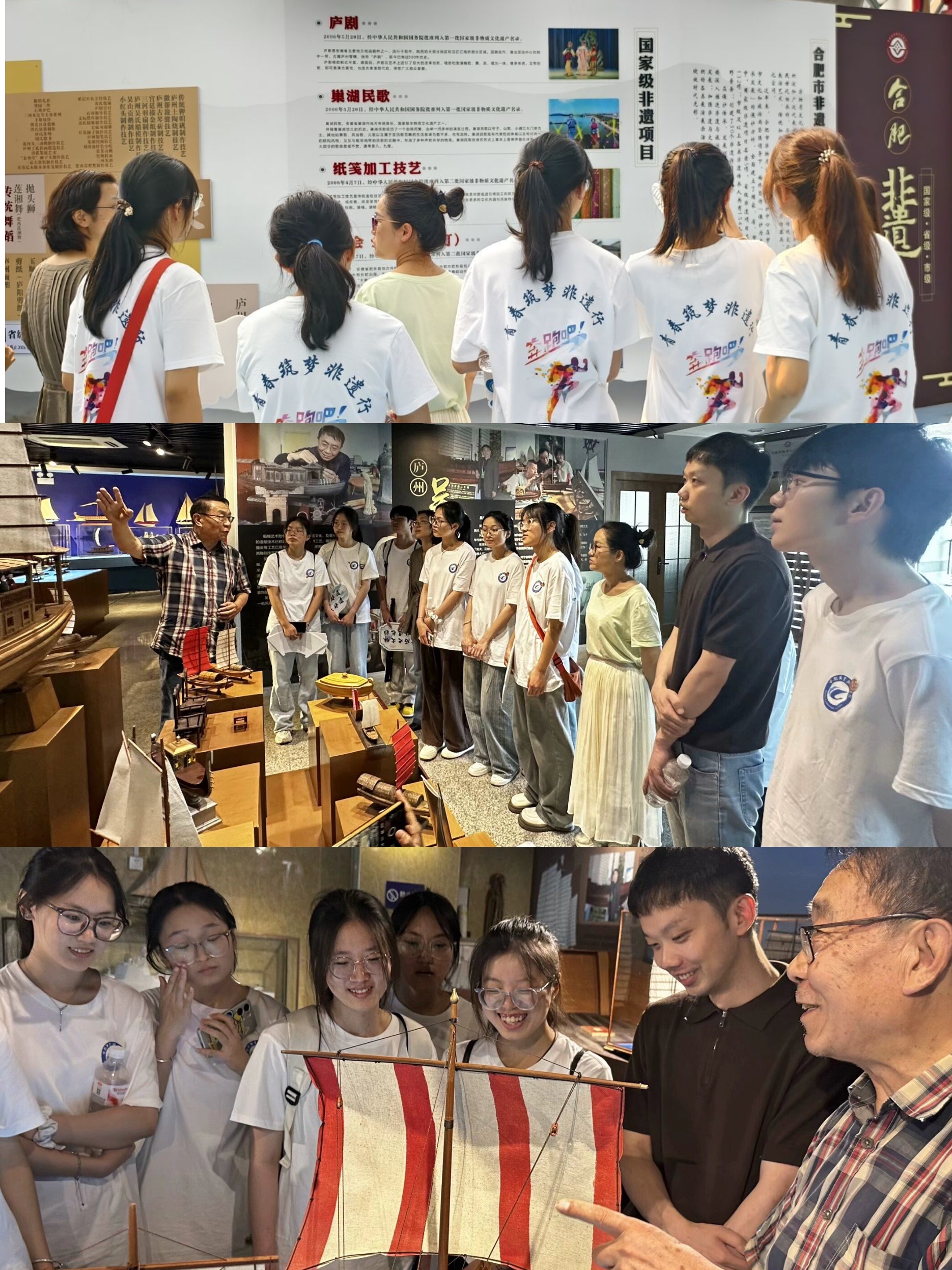 寻迹:探问非遗薪火,感悟守艺艰辛。6月24日,实践团队首站来到合肥市文化馆,参观非遗展厅。在琳琅满目的非遗项目展陈前,队员们系统了解了合肥地区丰富多彩的非物质文化遗产,从悠扬的庐剧到精巧的土陶、庐阳剪纸、庐州木雕、葫芦烙画、庐州蛋雕等手工技艺,感受着浓厚的地域文化底蕴。随后,队员们还专访了“吴氏船模”传承人吴培老师,吴老师给同学们讲述家族世代传承的故事,详细介绍并展示了工作室陈列的精妙绝伦的船模作品。面对学生关于“如何坚守船模制作技艺”“传承中最大挑战”等问题,吴老师坦言“热爱与责任是支撑”,几十年的坚守和对细节的极致追求,让队员们对“工匠精神”和守护非遗的艰辛有了直观而深刻的体悟。