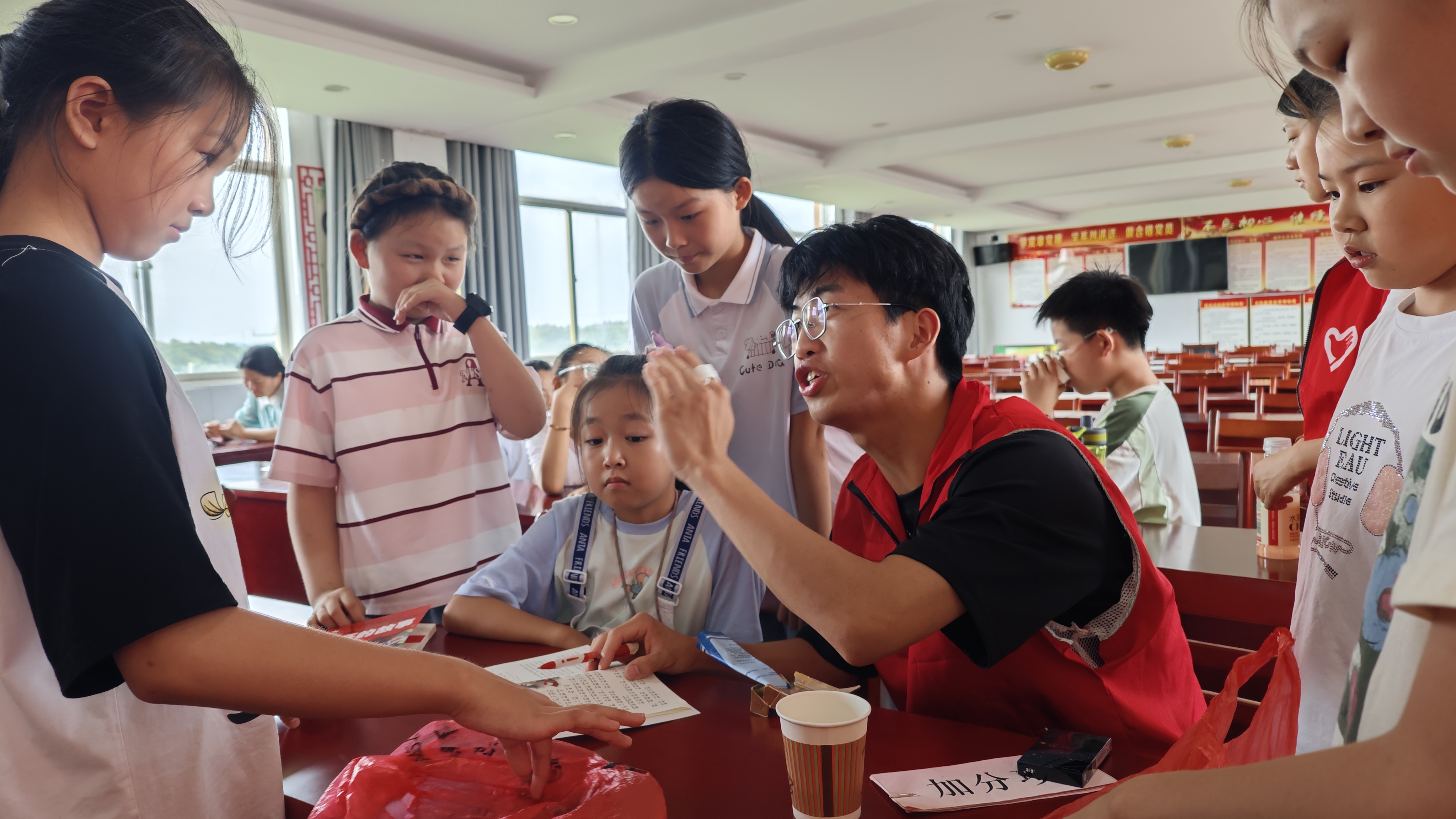 6月28日,《我眼中的家乡》主题绘画活动正式在大石乡人民政府展开,孩子们用稚嫩的小手勾勒青山绿水、温馨家园与连绵的瓜蒌田,童真跃然纸上。课后,实践团队员与孩子们奔向承载家乡特色的瓜蒌田进行合影留念,欢笑声回荡于绿野之间。下午的知识竞赛紧张激烈,孩子们:古诗默写笔锋沉着,数学逻辑争分夺秒,百科问答踊跃争先……同时,实践团也为孩子们发放文具与爱心礼包,激励他们在未来的学习道路上永远热情。随后,指导老师方悦老师以生动的讲解带领孩子们探索英语音标世界,为未来孩子们的英语学习点亮一盏明灯。