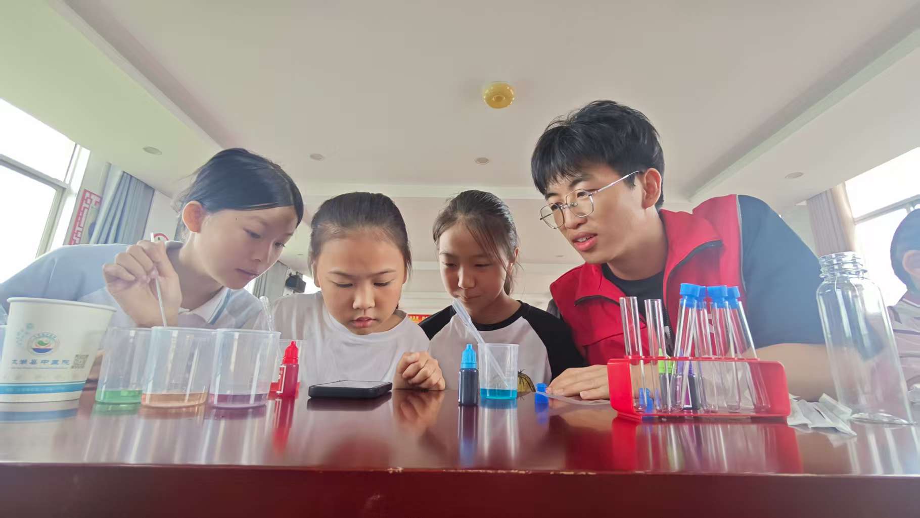 6月29日,实践团以物理与化学小实验开启奇妙的科学启蒙。“发光的电灯泡”让孩子们惊叹于电流魔力;“回家的滚轮”以重力势能与动能的转化揭示自然法则;“悬浮笔”的磁力奥秘将气氛推向高潮。而在“魔法气球”实验中,柠檬酸与小苏打的神奇融合,瞬间释放出的澎湃气体,更是让孩子们见证气球“自力更生”鼓胀变大的奇迹。实践团志愿者们纷纷化身“小老师”,让抽象原理在孩子们的亲手触摸间变得鲜活生动,让科学的种子悄然播撒孩子们的心田。