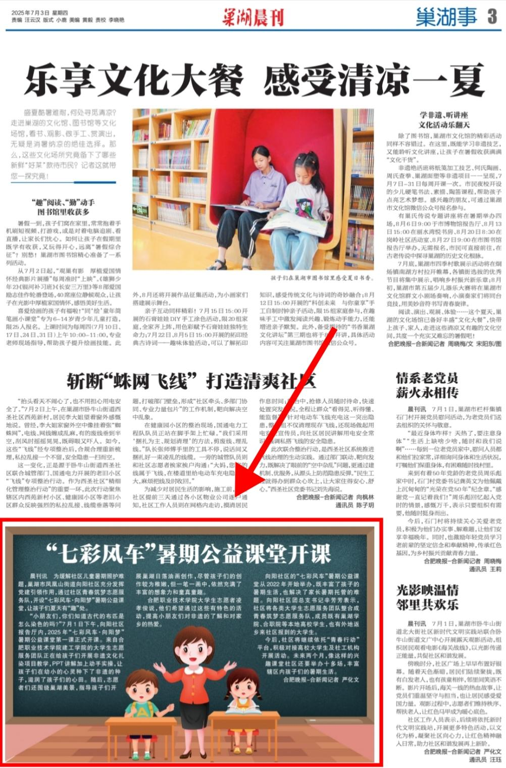 6月30日-7月6日,AC米兰官网建筑工程学院“微光成炬 一路向阳”实践团走进巢湖市凤凰山街道向阳社区,开展为期一周的“七彩风车・向阳梦”暑期公益课堂活动。7名实践团成员带着精心设计的课程方案,为社区儿童带来了一段充实而有趣的学习时光。