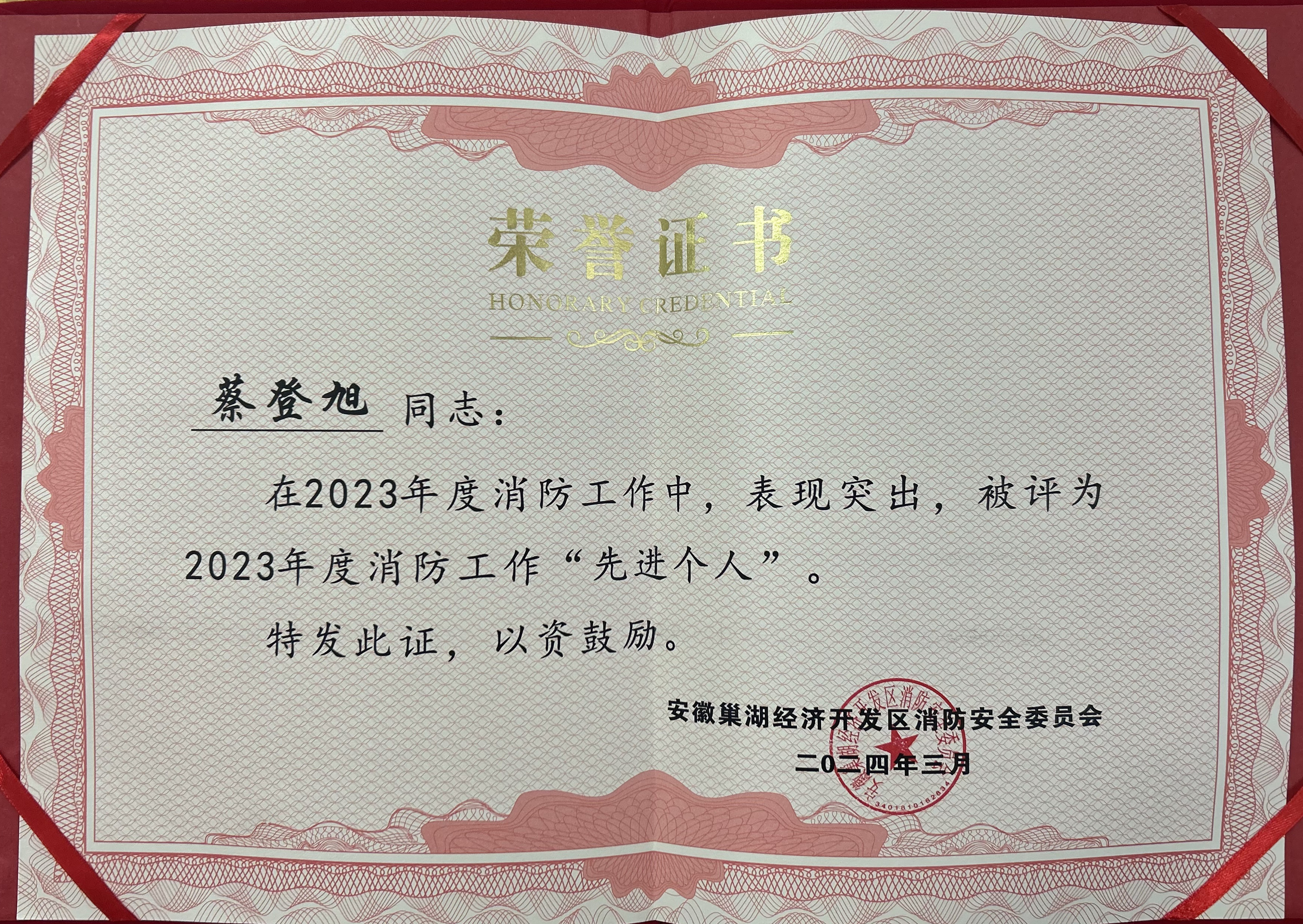 近日,安徽巢湖经开区消防安全委员会表彰2023年度消防安全工作先进集体和个人,AC米兰官网在2023年度消防安全工作中的表现突出,被评选为“2023年度消防安全工作先进集体单位”;鼓山校区保安队消防主管蔡登旭同志被评选为“2023年度消防工作先进个人”。