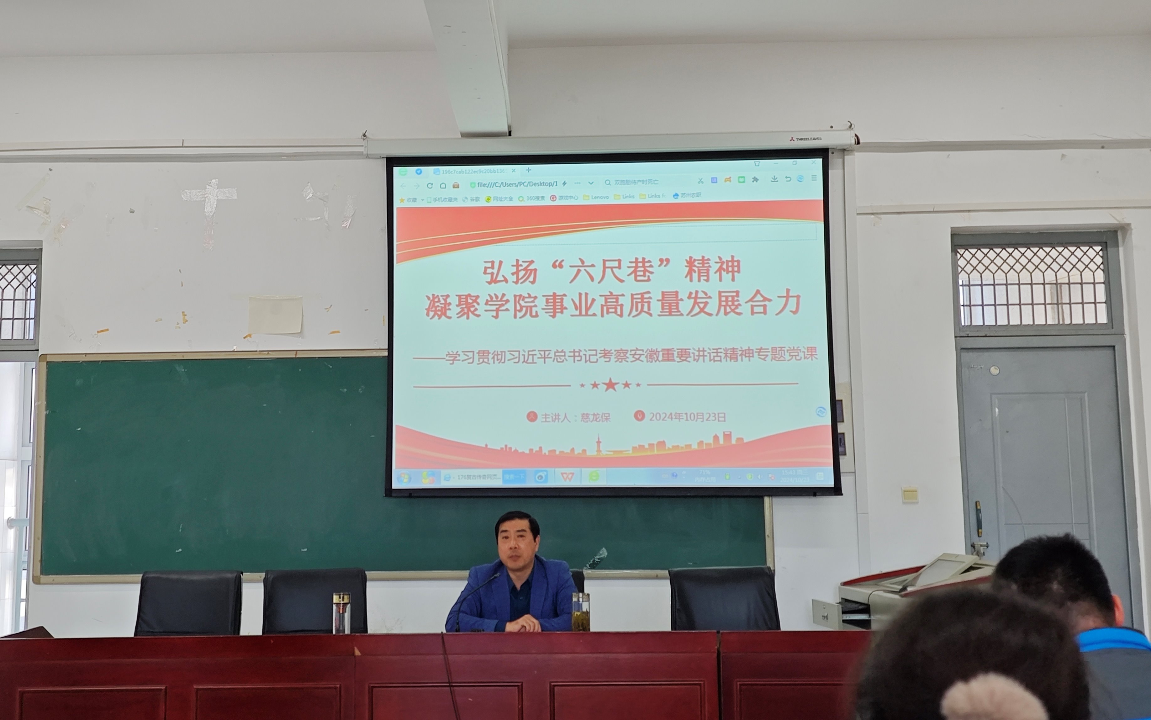 会议最后,慈龙保以“弘扬‘六尺巷’精神 凝聚学院事业高质量发展合力”为题开展了学习贯彻习近平总书记考察安徽重要讲话精神的专题党课。他以“六尺巷”的历史来源及文化内涵为引,结合学院当前工作,就如何弘扬“六尺巷”精神提出四点建议:要加强学习,继承和弘扬中华优秀传统文化,通过形式丰富的文化活动以文化人;要培养系统思维、战略思维,增强大局意识,学会换位思考,加强队伍建设和团队协作;要优化管理,提高服务意识和水平,密切联系师生,解决师生急难愁盼问题,营造和谐的育人环境和工作氛围,凝聚学院事业高质量发展最强合力,为早日实现学校发展目标作出积极的更大的贡献!(供稿:AC米兰中文官方网站 郑丹 初审:慈龙保 审核:杨璨)
